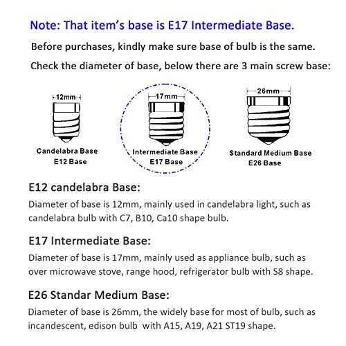 Specification: LED applaince Microwave refrigerator range hood over stove replacement light bulb equivalent 40W incandescent bulb E17 intermediate base 3W 360lm dimmable daylight color 5000K E17 intermediate screw base led light bulb equivalent incandescent bulb: 8206232A 8206232 1890433 AP4512653,WB36X10003,WB25X10030, 6912W1Z004B Application: microwave light bulb, range hood light bulb, refrigerator light bulb, over hood, over stove light bulb. 3W 360lm equivalent 40W Incandescent and halogen bulb. Base: E17 intermediate screw base Dimensions: (Width))22mm/ 7/8? X (Height)59mm/ 2 3/8?. Cover: Clear PC Cover. Working Voltage: AC110-130V/60Hz. Working Temperature: -4?-130?.