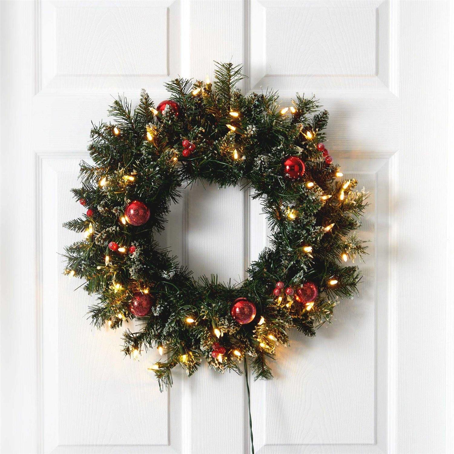 Light up your favorite seasonal accents while adding serious curb-side appeal with this artificial Christmas wreath intricately designed from realistic looking foliage in a palette of seasonal evergreens and accented throughout with faux holly berries and decorative ornaments to evoke a joyous, holiday spirit. Arriving pre-strung with 50 clear LED lights to effortlessly illuminate either a wall or door, this 24? (in circumference) decorative wreath makes for an inviting accent and will undoubtedly transform any entrance all throughout the holiday season. Silk plants are manufactured using synthetic materials, such as polyester material or plastic, and are well designed and constructed to be life-like in appearance. This item will need to be re-shaped when removed from the secure box to allow it to reach its fullest size. Your artificial plant will look beautiful for years to come; simply wipe clean with a soft dry cloth when needed.