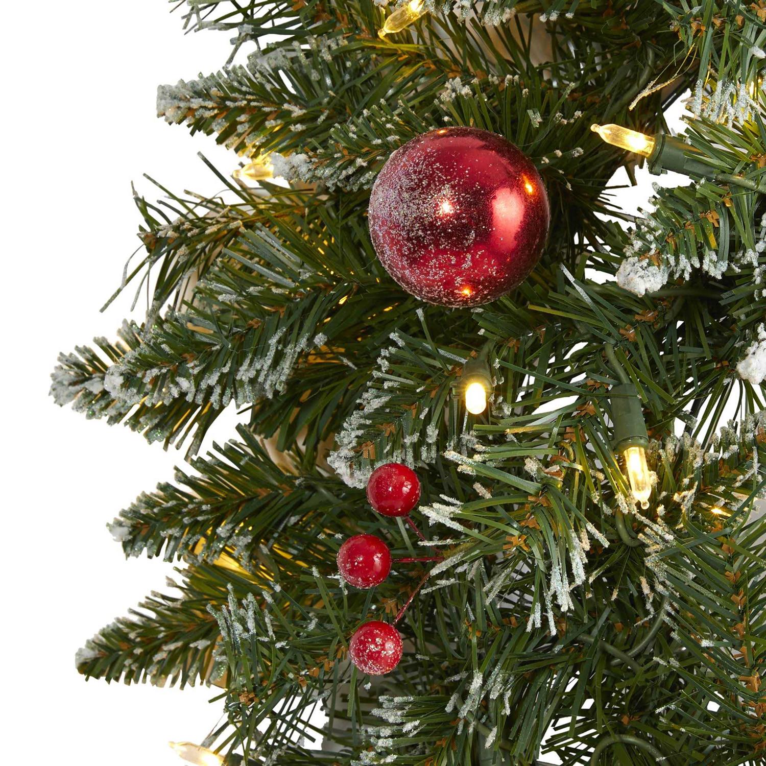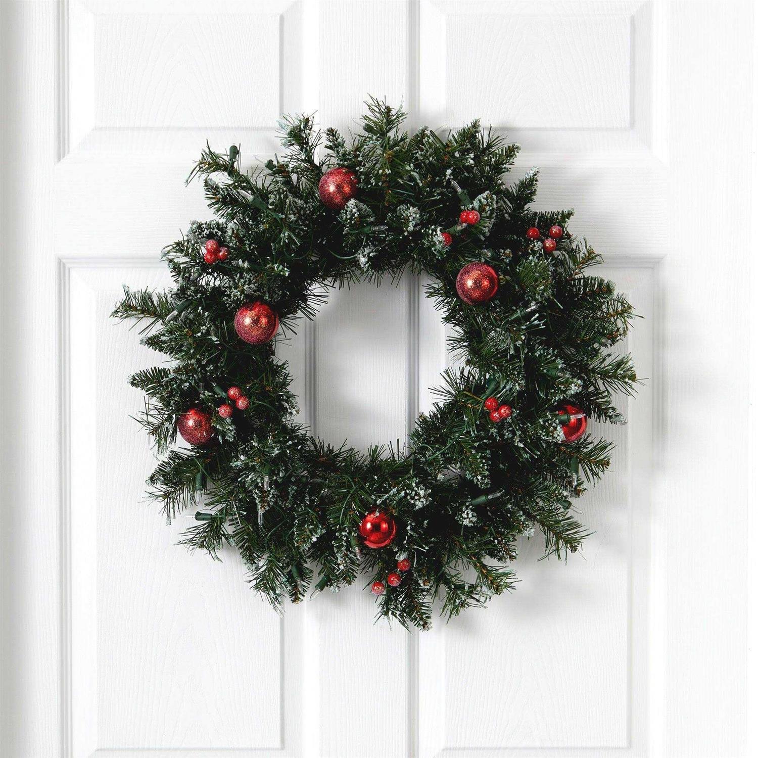 Nearly Natural 24in. Frosted Artificial Christmas Wreath with 50 Warm White LED Lights, Ornaments and Berries