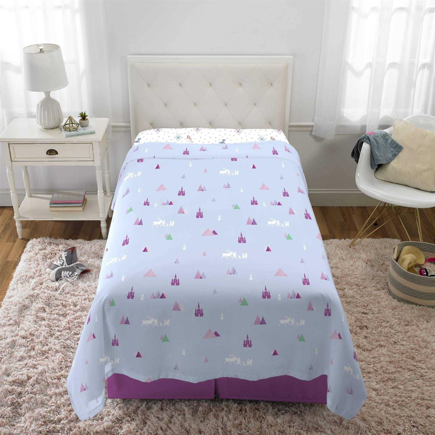 Seek the truth through the power of sisterhood with this beautiful twin sheet set. Vibrant and soft by turn this beautiful sheet set is perfect for the Frozen fan in your life. Utilizing silhouettes – this sheet set is the epitome of subtle elegance. Twin sheet set includes: one flat sheet, one fitted sheet and one standard size pillowcase.