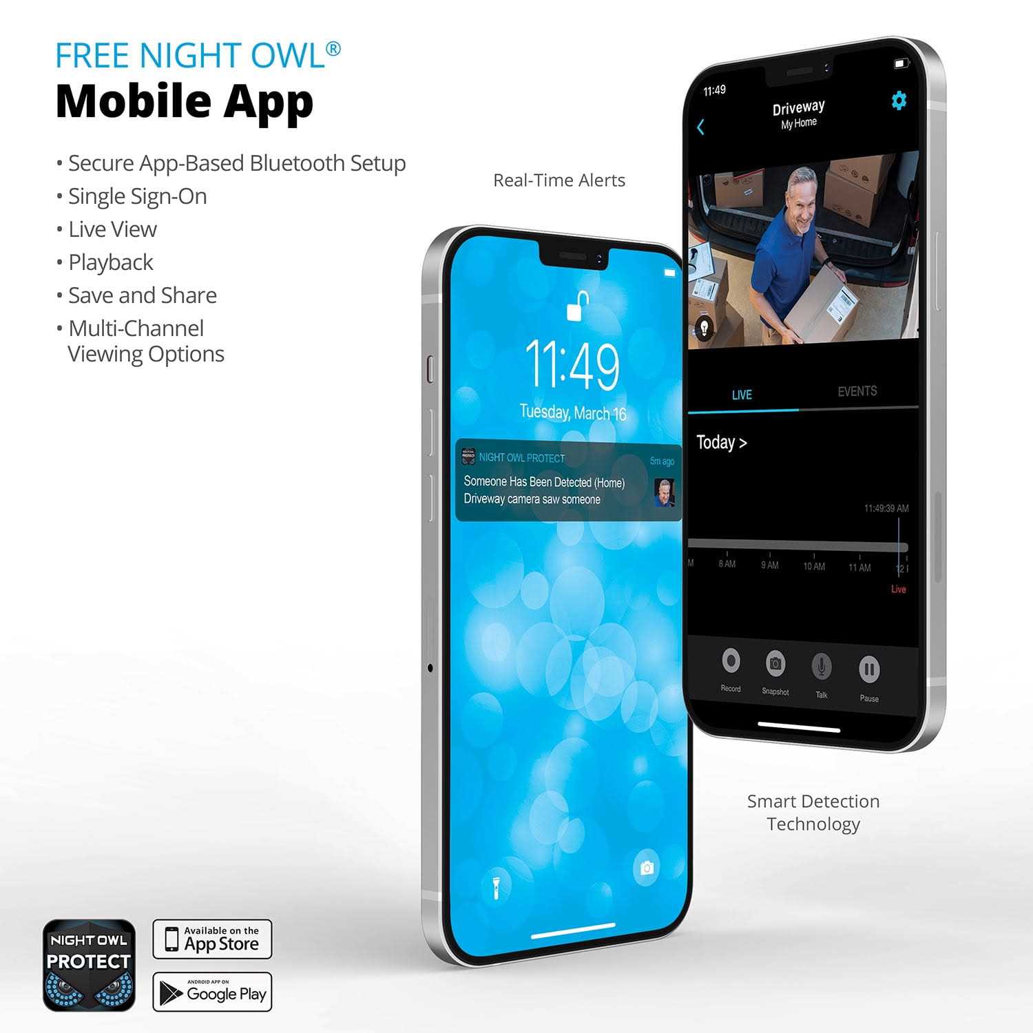 Night Owl is excited to offer our U.S. designed and engineered 1080p HD Bluetooth Digital Video Recorder with Wired 1080p HD 8 Channel Spotlight Cameras and Pre-Installed Hard Drive. With Secure App-Based Bluetooth Setup, there is no need to connect a TV or monitor for setup or viewing (optional). You can easily configure your system right from the app on your smartphone or tablet with the Bluetooth connection. While a TV or monitor is not required, with Google Assistant you can use simple voice commands to stream camera footage directly to your TV or monitor, all while remaining hands free. Each camera has 1-way audio (speaker) which works with our built-in siren and preset voice alerts. From within the app, you can easily activate the built-in siren, startling intruders and sending them packing. Have a guest but cant get to them? Use a preset voice alert to let them know! Smart Detection Technology including Human Detection, Facial Capture and Vehicle Alerts reduce the risk of false alarms, keeping you safe and well protected. Facial Capture lets you see who is on your property by snapping a photo and sending the image to your Smart Device. Motion-activated spotlights flood your yard with bright lights when human motion is detected, instantly warding off trespassers. Proudly designed and engineered in the U.S.A., our security system uses a wired connection for uninterrupted viewing with no delays. Our app gives you control of your system and easy access to your recordings, regardless of where you are. Night Owl never charges fees for storage or access to your videos. All recordings are securely stored on a pre-installed hard drive for convenience. You can view and download the recordings as you need them. This system provides the latest technology to give you the ultimate security experience. NOTE: The DVR is compatible with our DP2 Series wired BNC cameras and our WNIP2 Series Wi-Fi IP devices, but is not backward compatible with other Night Owl products.