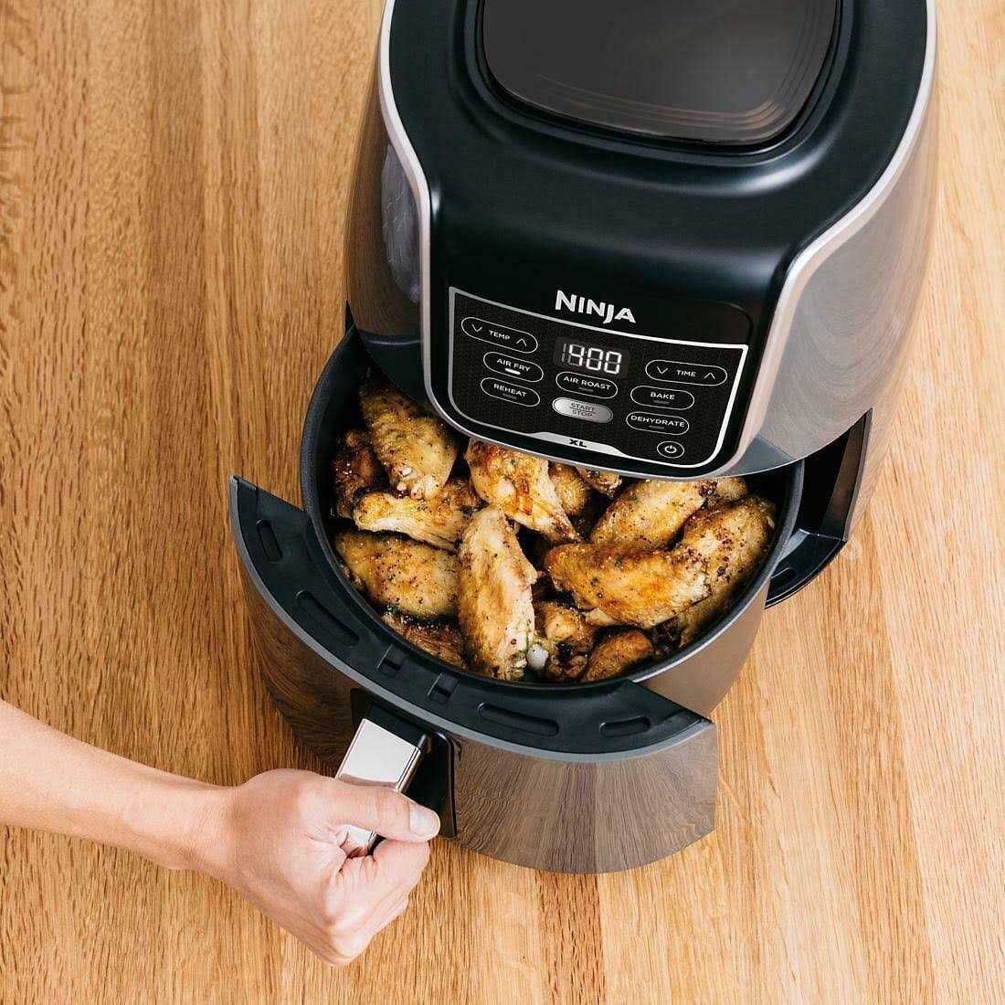Meet the Ninja Air Fryer XL, a fast and easy way to cook your favorite foods. Cook and crisp up to 3 pounds of French fries or wings, using little to no oil, in a family-sized XL 5.5 quart basket. Now you can enjoy guilt-free fried foods- air fry with up to 75% less fat than traditional frying methods. With four different versatile cooking functions (Air Fry, Roast, Reheat, and Dehydrate) and a wide range of temperatures, you can cook your family’s favorites quickly and more healthfully than traditional deep frying. The super-fast airflow allows for even heating and crisping, and the easy-to-clean 2-layer nonstick-coated basket makes cleanup a breeze. This multifunctional unit helps you get the most out of your air fryer- make crispy French fries to go with grilled burgers, reheat leftovers without making them soggy, bake delicious desserts, and more. Make crispy meals and snacks for the whole family with the Ninja Air Fryer XL.
