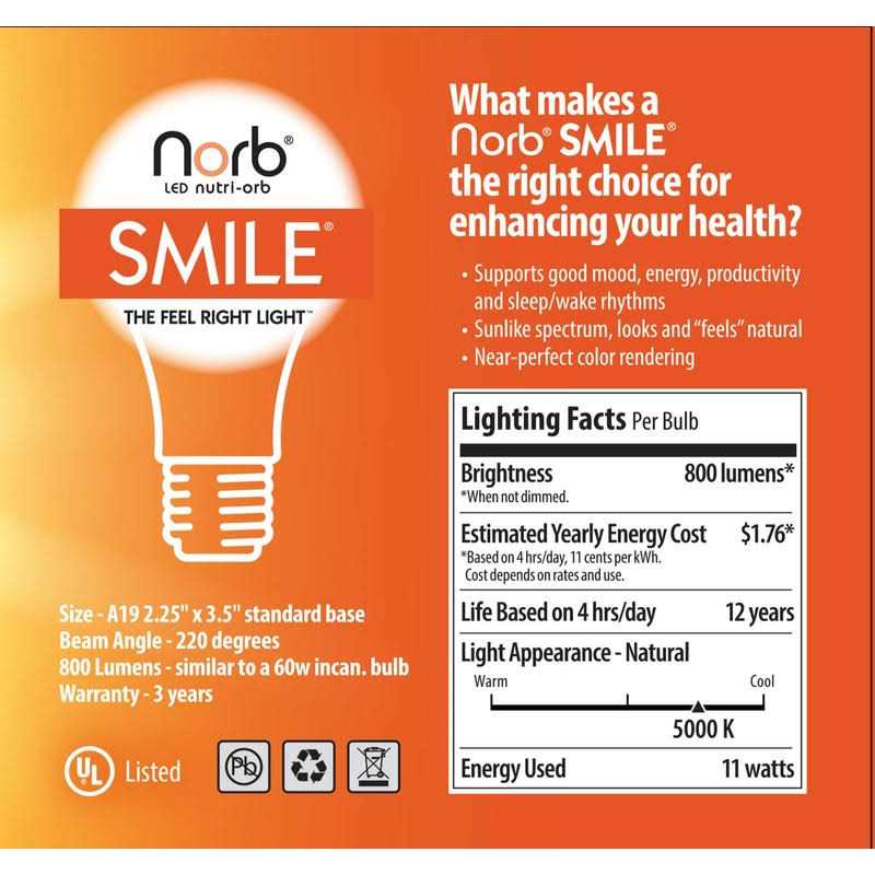 NorbSMILE Full-Spectrum “Sunlike” Premium A19 LED Light Bulb. Boosts Energy, Mood & PERFORMANCE. Supports Circadian Rhythm. Near
