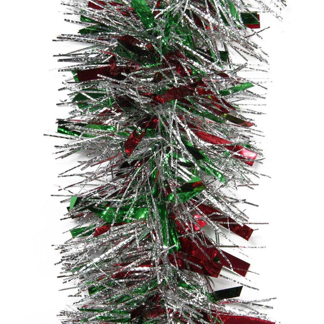 Nothing says Christmas like a good old fashioned tinsel garland! Green and red wide-cut tinsel combine with thin cut silver tinsel to make a full and dimensional decorating piece. It’s perfect to decorate trees, mantels and railings.
