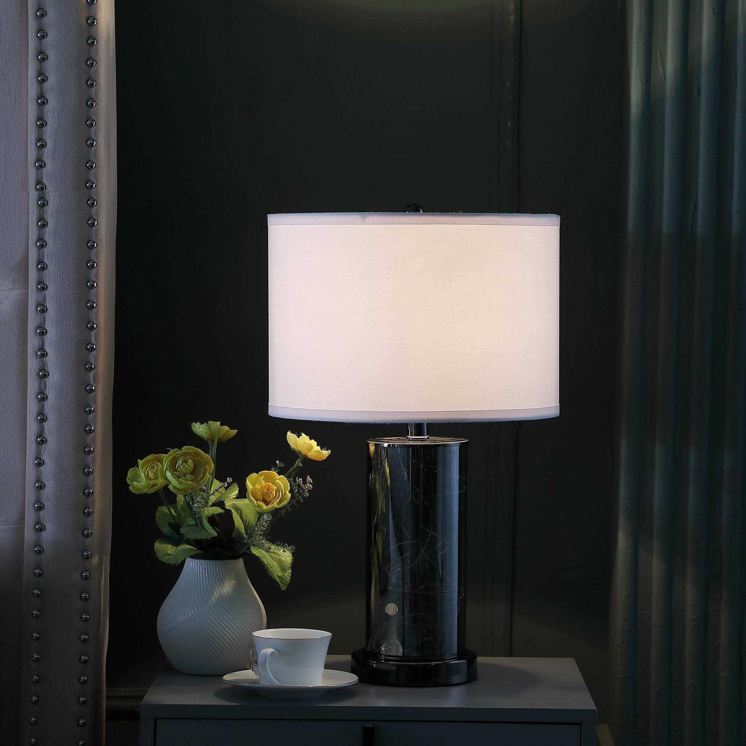 - Black Chrome Metal, Glass Cylinder Body, White Cotton/Linen Drum Shade.