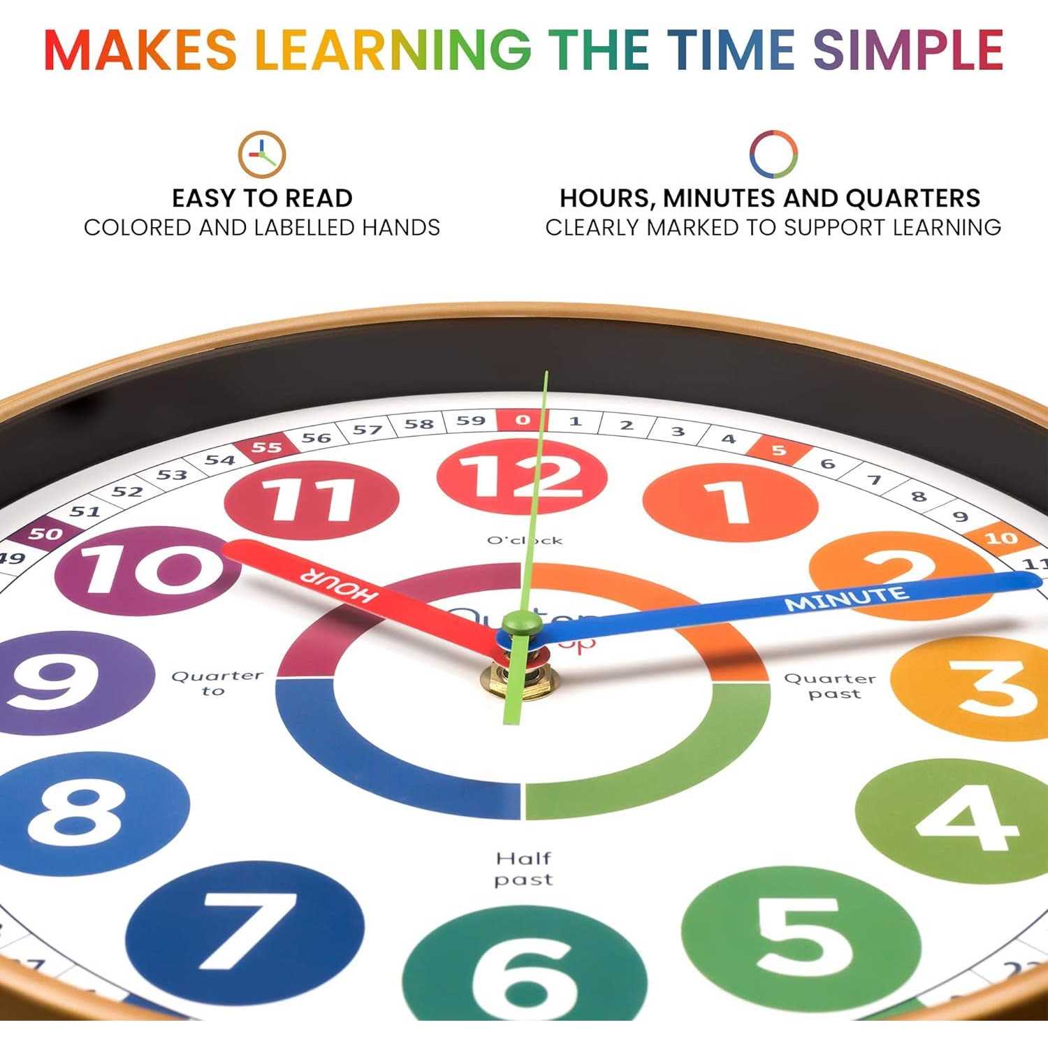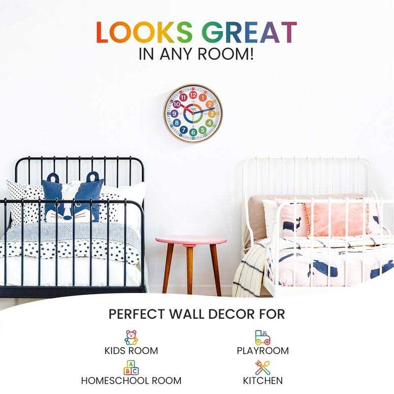 Designed by Teachers and Parents Our 10 inch kids wall clock is easy for kids to understandn – Have Fun Learning Inspire kids to learn to tell time with our colourful engaging clock and free e-bookn – Ideal Gift with its own Fun Gift Box Just insert 1 AA battery (not included)n – Looks Great in any Room ? Perfect for kids room, homeschool room, playroom, nursery or school classroomn – No Distracting Noises with our Silent Clock Beautifully designed quality clock with a kid safe acrylic face