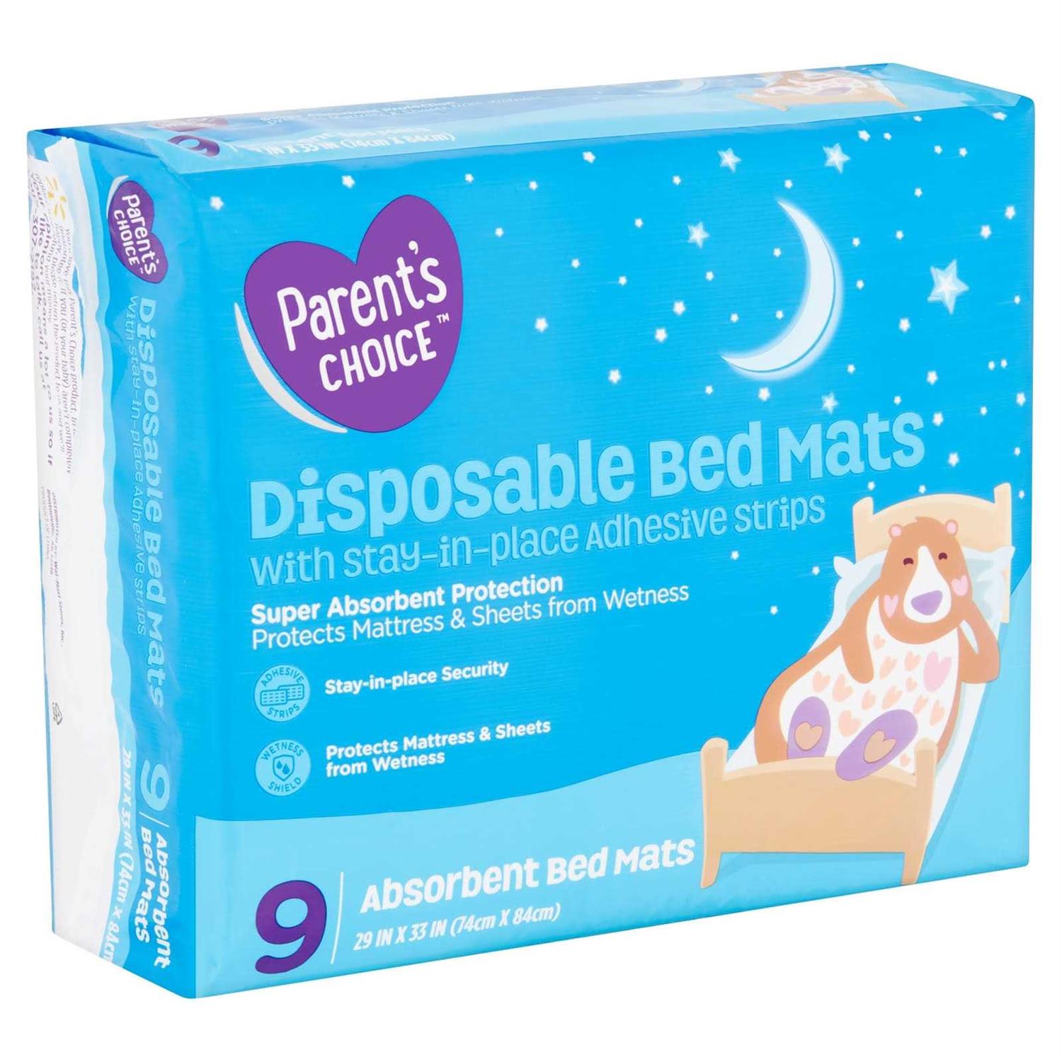 Make nights easier for both you and your child with Parent’s Choice Disposable Absorbent Bed Mats. These super absorbent pads protect children, mattresses, and sheets from wetness. 1 in 5 kids experience nighttime wetting. Our bed mats absorb liquids and wetness instantly, leaving your little sleeper and the bed dry. They reduce the time between changes of bedding, which reduces frustrations and encourages your child’s confidence. With a stay dry top layer, a moisture barrier, and a super absorbent core, our pads help take the pressure off. They feature stay-in-place adhesive strips that keep them securely in place on top of your child’s bed sheet in case he or she moves throughout the night. These mats measure 29 x 33 inches and are just right for a twin bed. This package has 9 disposable bed mats for your convenience. When it comes to giving parents and children an easier night’s sleep, Parent’s Choice Disposable Absorbent Bed Mats have it covered. Parent’s Choice provides parents with baby and toddler products you need at a price that won’t push your budget over the edge.