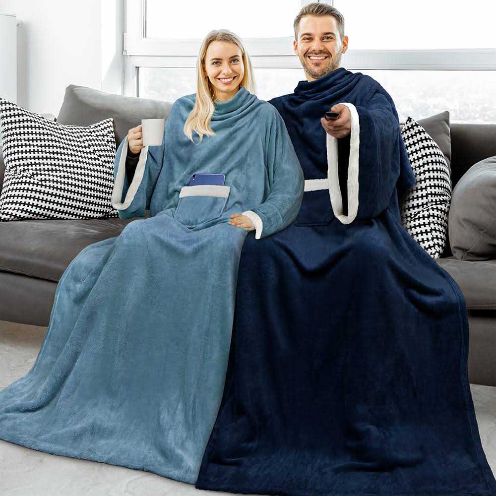 Luxurious Fleece Blanket with Sleeves by Pavilia This Luxurious Fleece Blanket with Sleeves by Pavilia is constructed with 260 GSM of microfiber polyester that is extremely comfortable with a luxurious feel at the same time. Ideal for keep you cozy while lounging and watching tv, the blanket also comes with sleeves and a functional pocket so you have full arm mobility while relaxing on your sofa/bed! Its also long enough to wrap around your feet for extra warmth. Measures 70 x 50 and various popular colors so you can mix and match! Pavilia is the Comfort You Can Trust. Our Vision To provide premium home goods that improves and enriches the life of everyone. Our blankets comes in different patterns, trims, and colors, making them the perfect choices for mixing and matching, and complementing your home.