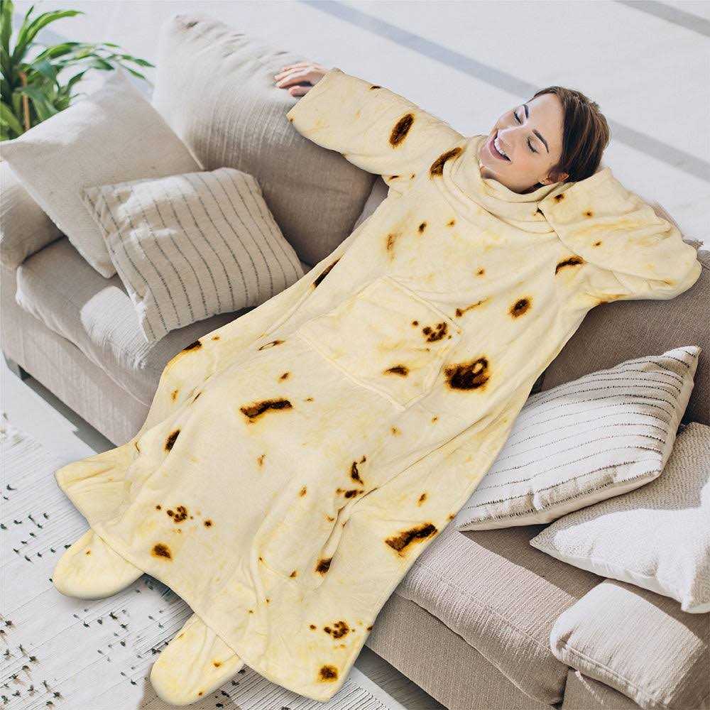 • WEARABLE LOUNGING BLANKET Large arm sleeves allow for full arm mobility and the front pouch can store TV remote, phone, tablet, snacks, and more.