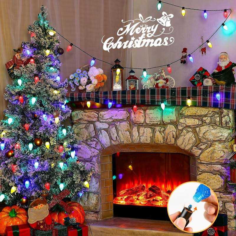 C9 Christmas Lights:Pellimo Christmas string lights on green wire has 50 led C9 strawberry bulbs(Size:2.6”*1”),length between lights:7.8inches,leading line:6.5ft,light string:26.5ft,length totally:33ft.Just plug in and unplug it for power on and off. Safe to Use:29V low voltage Christmas lights outdoor with UL certified,made of high quality plastic material and high bright LED beads,not easy to damage and keep at a low temperature state after lighting up for hours,safety and durable. End-to-End Connectable:Designed with Male and Female Safe Plug,each C9 string lights allow up to 10 sets to be connected together,extending the length to a maximum of 330 ft approx with 500 LED, which can be used to decorate your lighting area to the desired length and powered by only one plug. Each bulb comes with a hanging clip for easy installation and hanging. Decorative String Lights with 8 Modes:Just press the button on the power adaptor to change 8 shining modes:Combination,In Waves,Sequential,Slo-glo,Chasing/Flash,Slow Fade,Twinkle/Flash,and Steady On.Best decor for Christmas,Thanksgiving,graduation,Valentine’s day,Halloween,holiday,wedding,party with our clear bulb green wire mini string lights. PACKAGE:1 x 50 LED Multicolor C9 Christmas Lights with Adapter