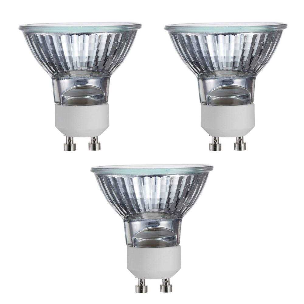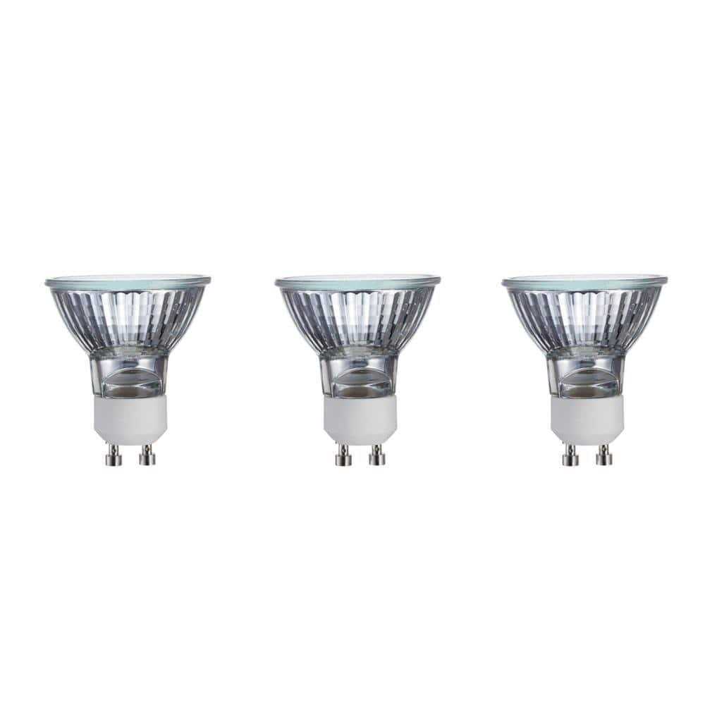 These three Philips 50-Watt Halogen GU10 Flood Light Bulbs each emit a bright 430 lumens of light and are rated for a service life of up to 3,000 hours. They’re just right for accent lighting, track lighting, and pendant fixtures. These flood light bulbs install in fixtures that accept GU10 bases. Using 50-Watt of energy, the bulbs are also dimmable to allow for varying light preferences.