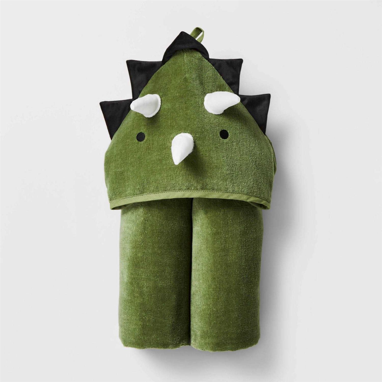 Make bath time exciting and help baby stay cozy with the Dinosaur Hooded Towel. Boasting a 100percent velour cotton construction, this baby hooded bath towel easily drapes around them and feels soft against their skin. Plus, the attached hood ensures they stay toasty after a bath and until you get them dressed. In a green hue, it features a dinosaur face and scale accents over the hood to bring fun flair to their bathing essentials. Designed with a loop behind the hood for easy hanging, you can simply toss it in the washing machine for added convenience. Age Group: kids. Pattern: Solid.