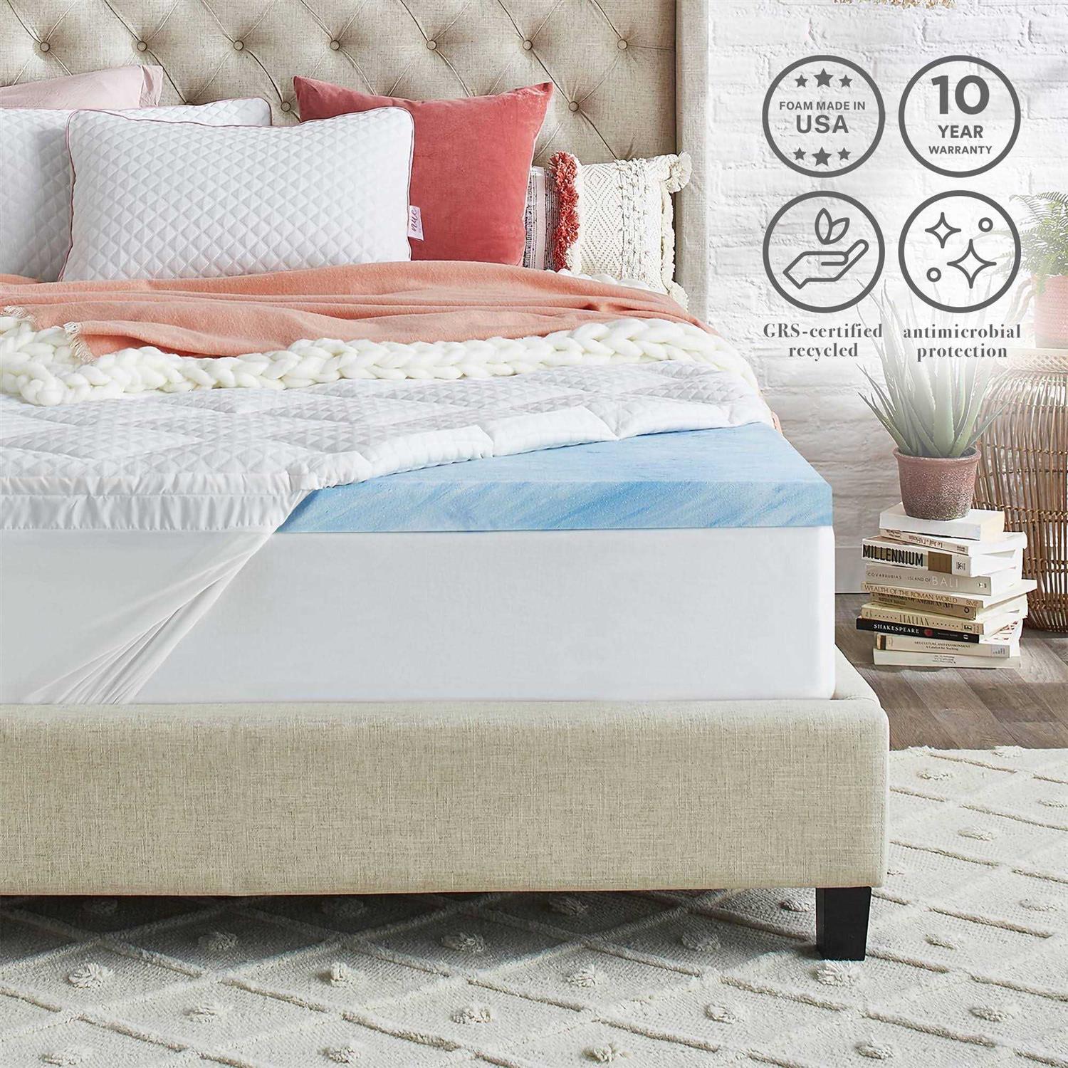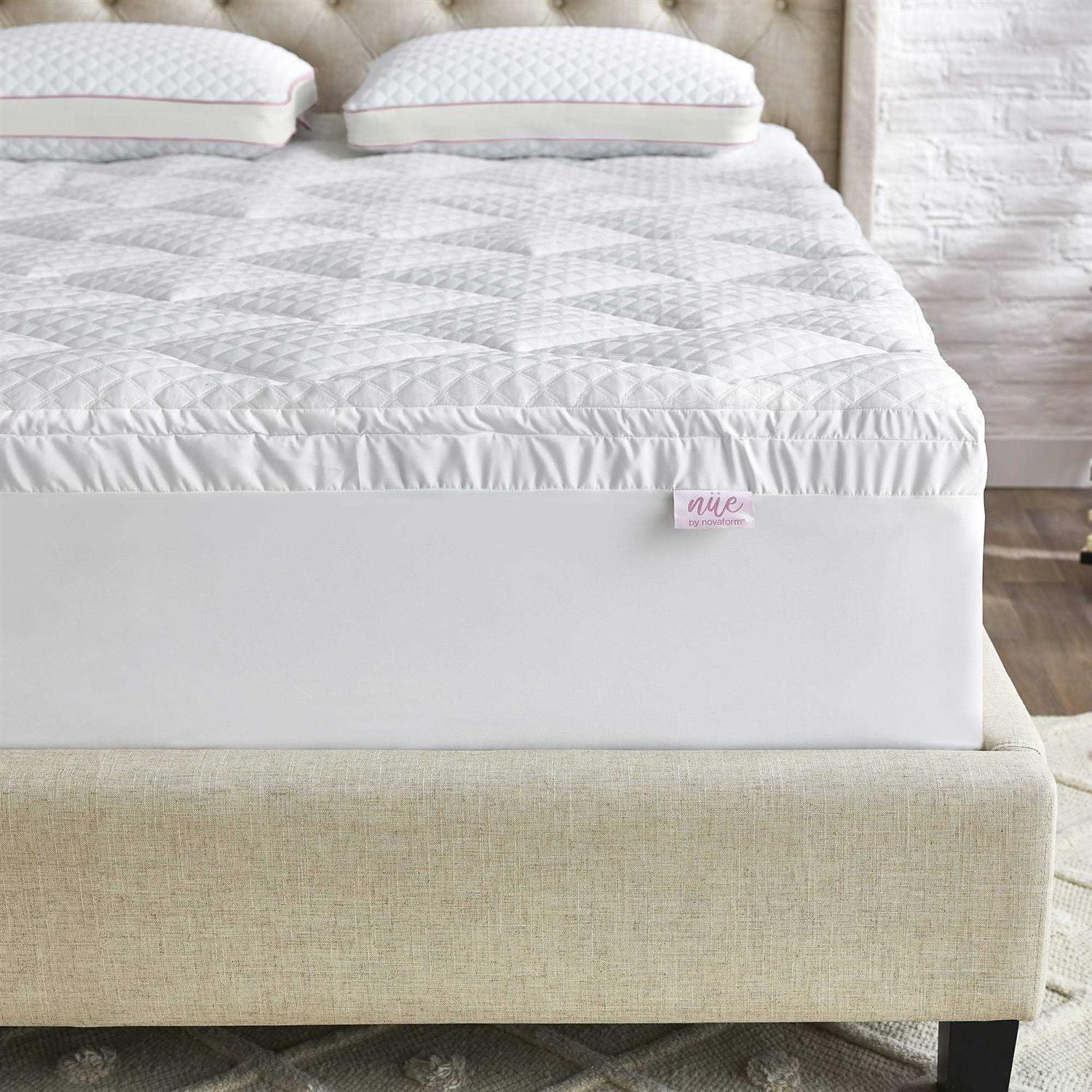 Life is too short to skimp on comfort. Give your mattress and body the indulgent softness they need with the perfect combination of plushness and support dual layers of pillow top and gel memory foam. Cooling gel memory foam reduces heat build-up and relieves pressure points, letting you sleep peacefully throughout the night. It conforms to your unique curves for gentle body alignment. A beautifully tailored, quilted cool cover with diamond-pattern stitching and fiberfill stuffing cradles on impact. It acts like a fitted sheet, stretching to fit mattresses up to 17-inches deep. Just add the nue by Novaform California King plush mattress topper to any old or new mattress, and youve got a refreshing recipe for instant sleep bliss.