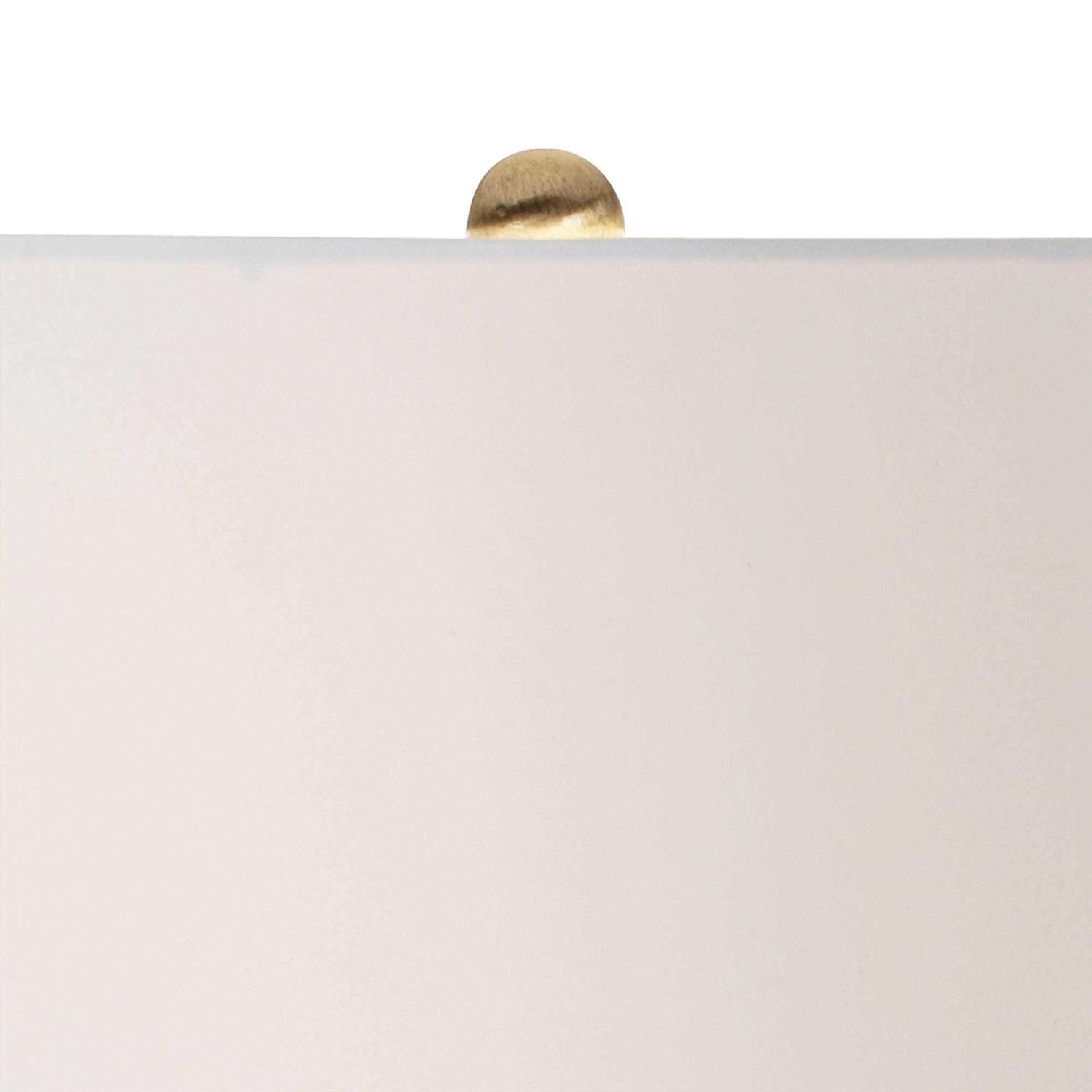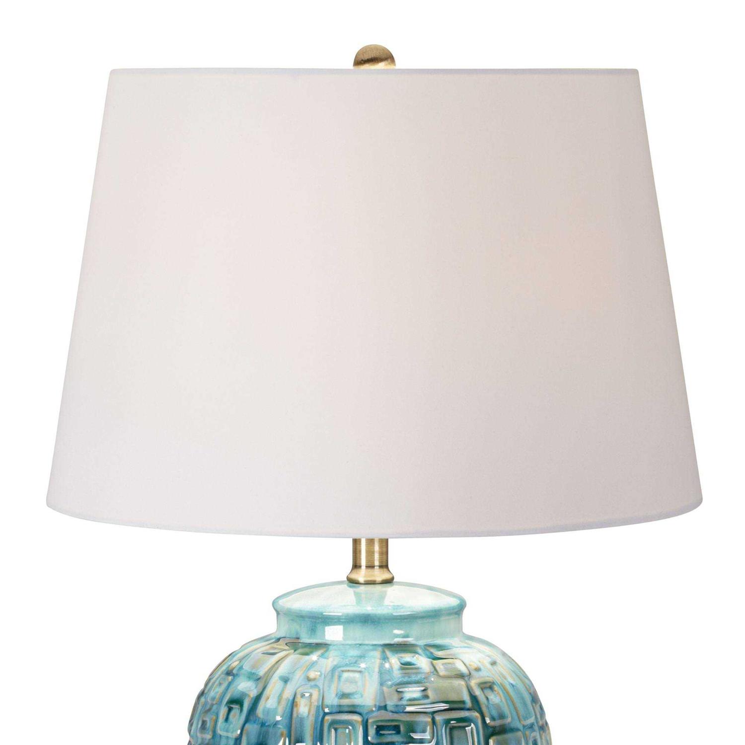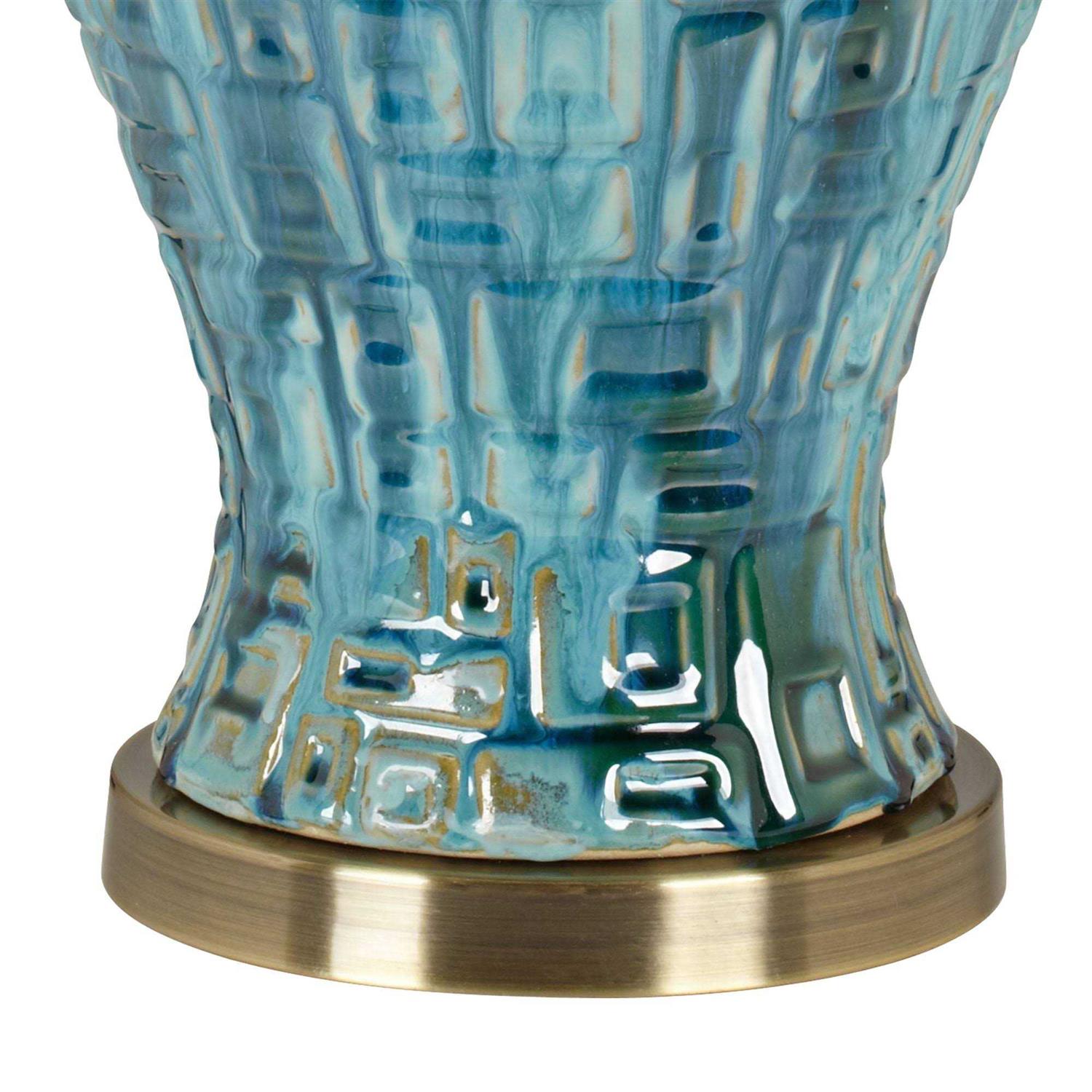 Bright, glossy teal is the highlight of these temple jar-style ceramic table lamps. The curved bases are textured and are accented by an antique brass finish foot and neck. Up top, crisp white empire shades diffuse the light in modern style. A round, antique brass finish finial completes the look. Please note that because of the handmade nature of the lamp bases, there may be slight variations in pattern and color.