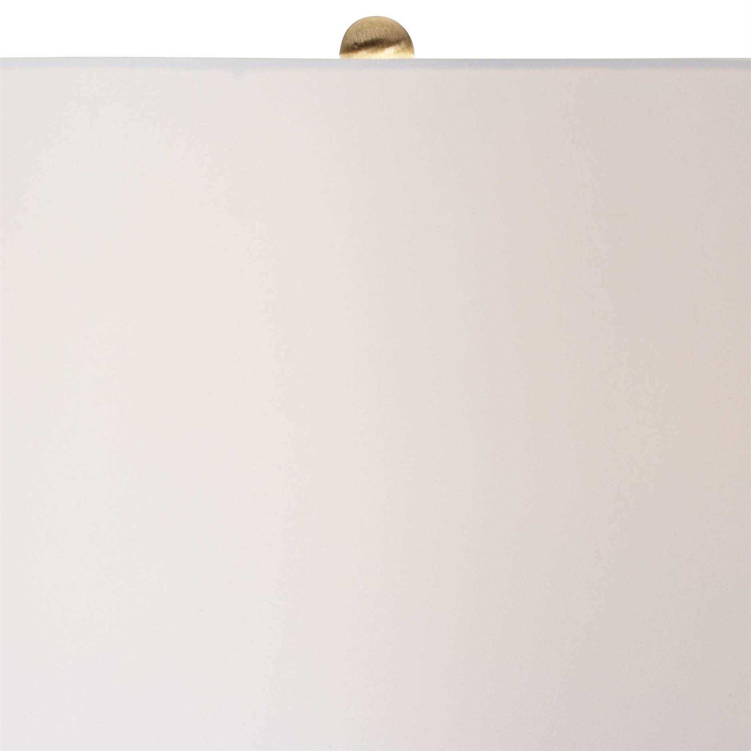 Bright glossy teal is the highlight of this temple jar-style ceramic table lamp. The curved base is textured and sits between an antique brass finish foot and neck. Up top a crisp white empire shade diffuses the light in modern style. A round antique brass finish finial completes the look. Because of the handmade nature of the lamp base there may be slight variations in pattern and color.