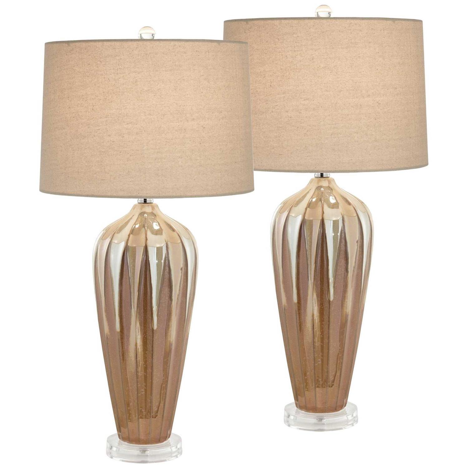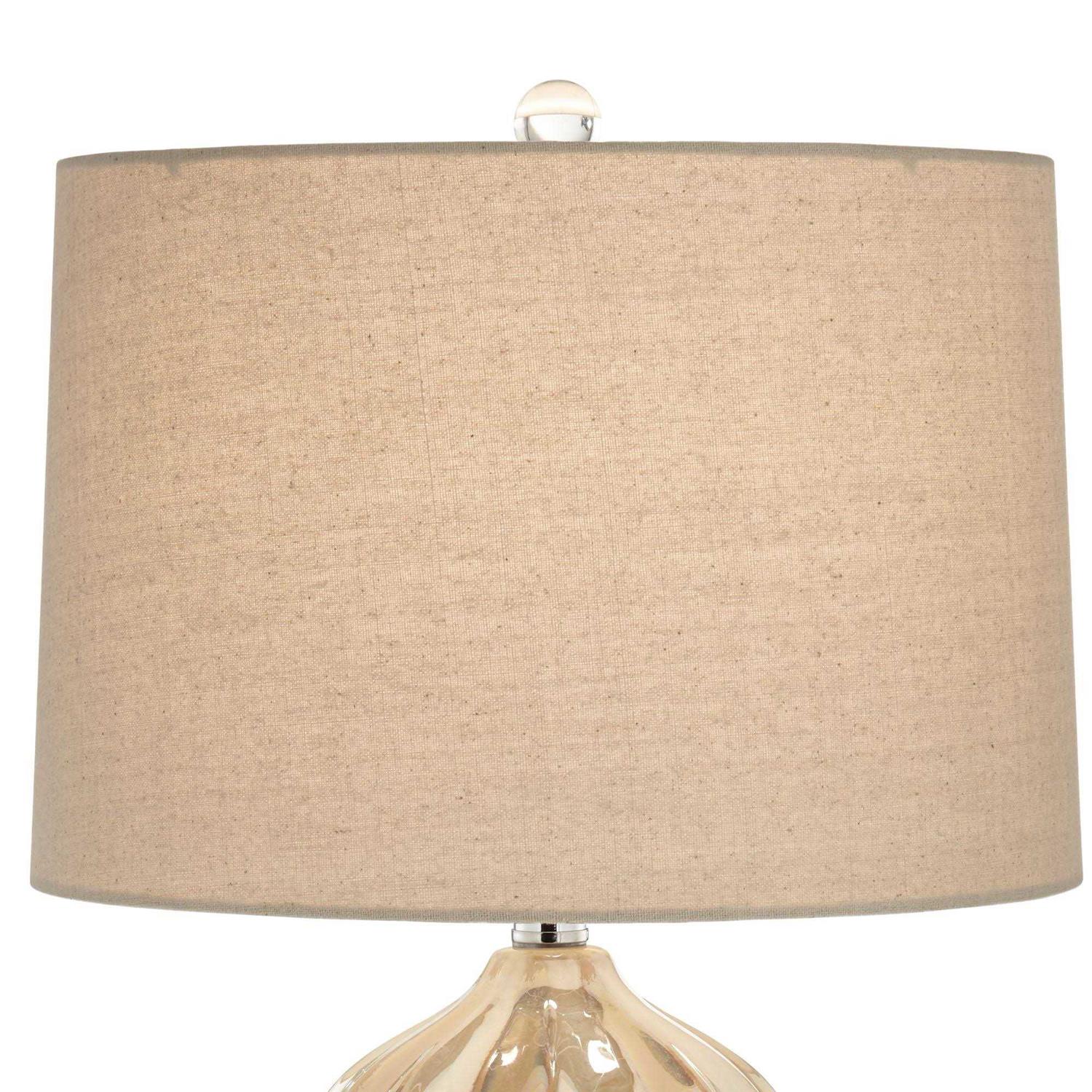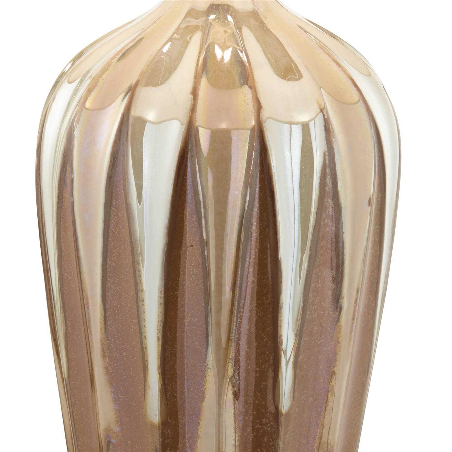 Featuring a warm earth-toned color, these tapered ceramic table lamps feature an ivory drip design for a striking effect. The stylish look sits on top of a clear acrylic base for a modern touch. A drum lamp shade sits on top of each lamp. Since each ceramic base is handmade, there may be slight variations in pattern and color.