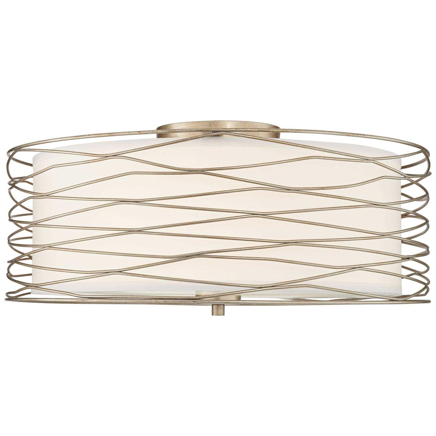 A spun silver finish metal frame winds itself like rivulets around the white inner shade of this flushmount ceiling light. The transitional style design is sure to add interest and contemporary appeal to your living space. Featuring a bottom glass diffuser this ceiling light will make a great addition to family rooms, bedrooms, and more.