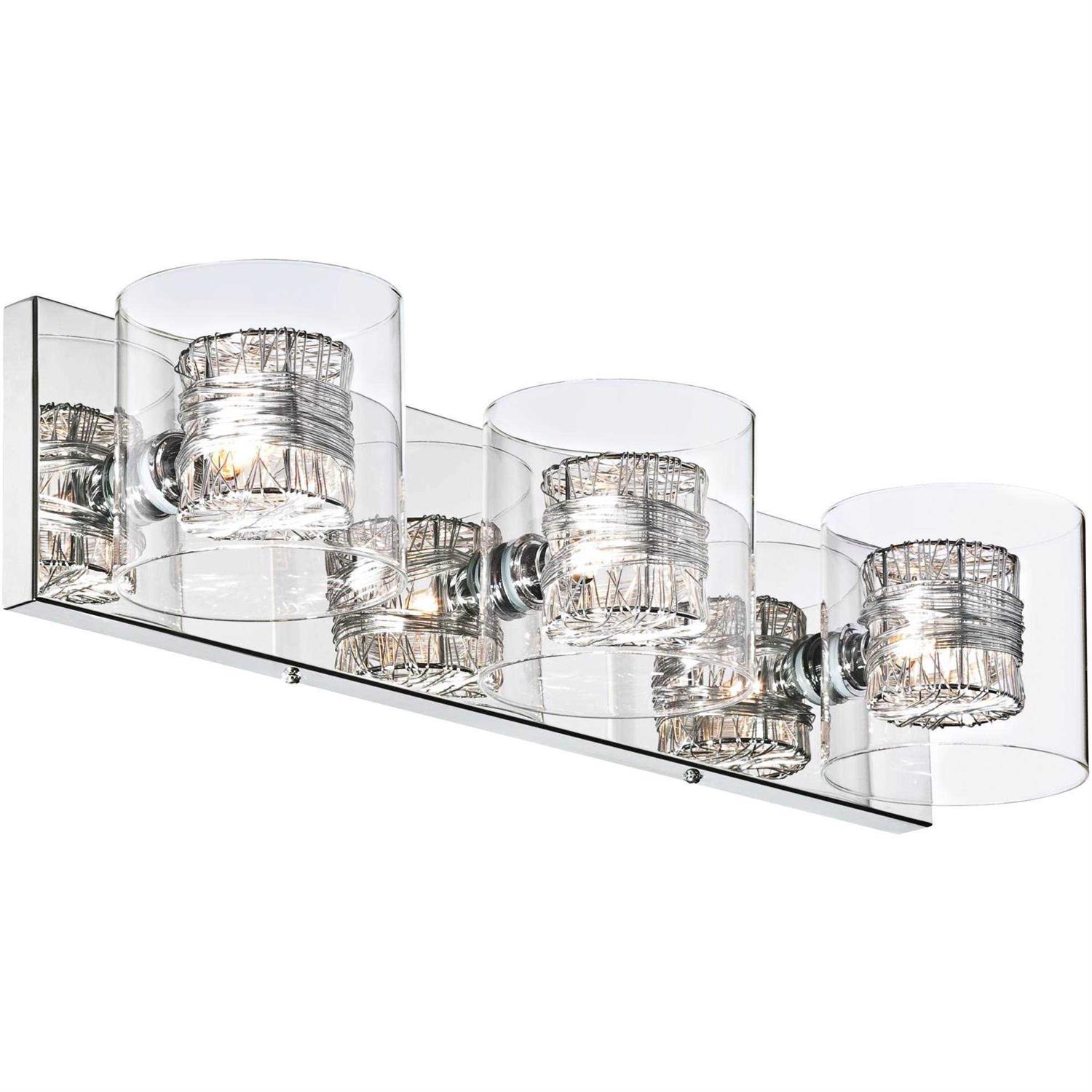 Wrapped wire borosilicatebathroom light. Anodized handmade aluminum cylinder. Borosilicate glass. Polished chrome finish. From Possini Euro Design. Extends 6-inches from the wall. 22-inches wide. 5 1/8-inches high. Includes three 40W G9 halogen bulbs. Fixture can be installed either horizontally or vertically.