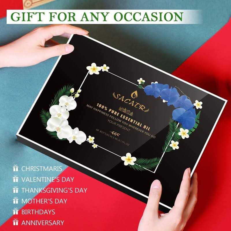 ? Top 60 Essential Oils Gift Set?: Our essential oil set includes 60 5ml/0.17oz bottles of aromatherapy essential oils, give you the most variety choose for different scenarios & needs.Including: Lavender,Peppermint,Ylang Ylang,Sweet Orange,Eucalyptus,Rosemary,Tea Tree,Lemongrass,Patchouli,Lemon,Rose,Jasmine,Chamomile,Frankincense Grapefruit,Bergamot,Clove,Clary Sage, Cinnamon,Laurel,Vanilla ,Geranium,White Tea ,Sandalwood, Immortelle and more. 100% Pure & Natural?: All our aromatherapy oils are extracted directly from different parts of plants ,mainly extracted by steam distillation and professional bottled to preserve lasting fragrance. With brown bottles to help keep the oils fresh and also guard against light degradation.The fragrance oils are for external use only. Long lasting fragrance?: Extracting essential oils by distillation,Keep the original fragrance,the fragrance lasts longer! Perfect for homemaking scented candles, soap, bath bombs,It can make Perfume; unscented incense sticks or cones; bodycare and haircare formulations; aroma diffusers; homemade cleaning products;Perfect For DIY. Widely Use?: High-quality essential oils kit is suitable for Home & Kitchen,Toilet,Offices, Massage Facilities, SPA & Beauty,Automobile and more.Use the best essence oil to make the most satisfactory product. The Best Gift Set : There are 60 different scents, there is always one scent she will like. Perfect ideal starter gift set for women, seniors, workmates, adults on any purpose occasions Birthday, Wedding Anniversary, Mother’s Day, Father’s Day, Christmas and New Year.