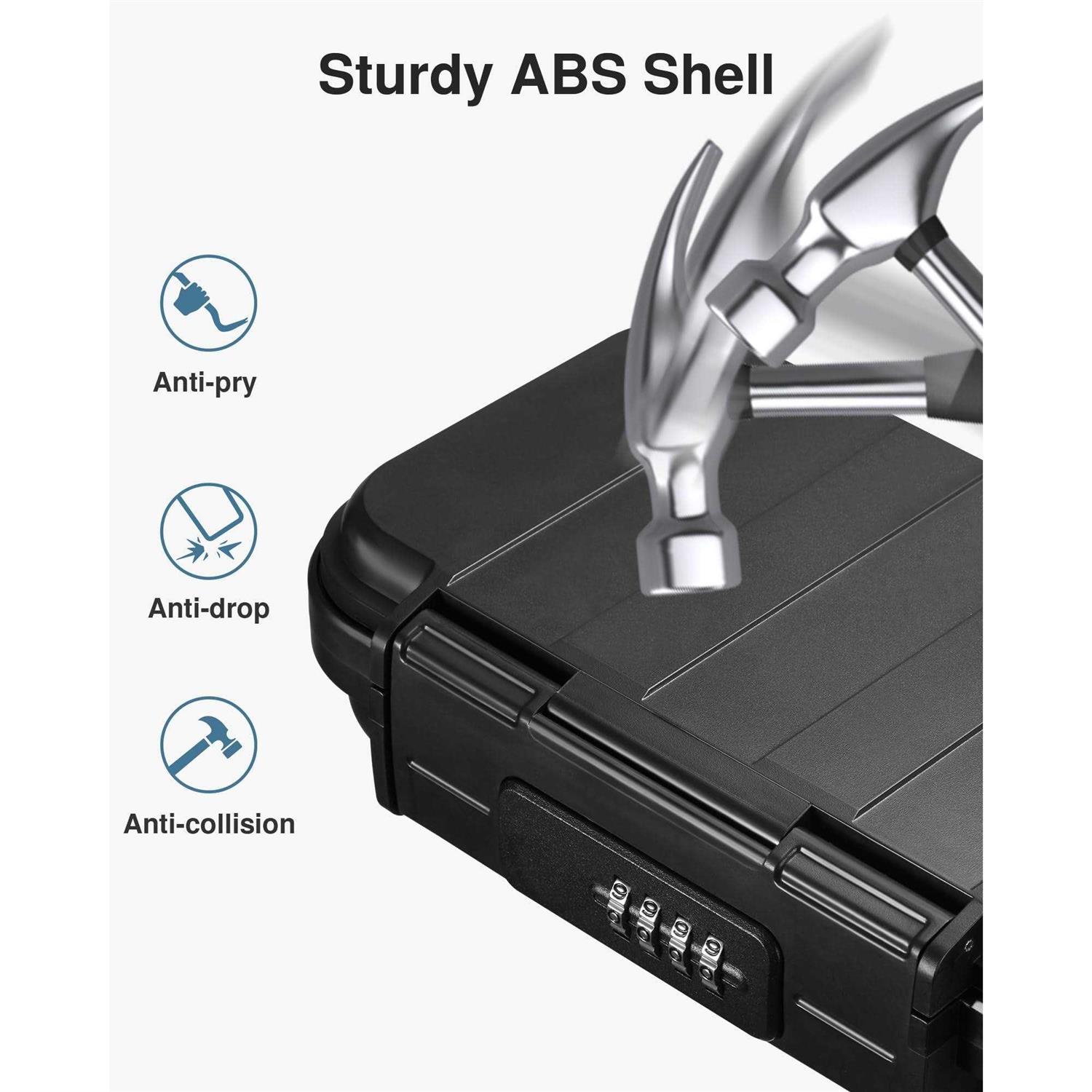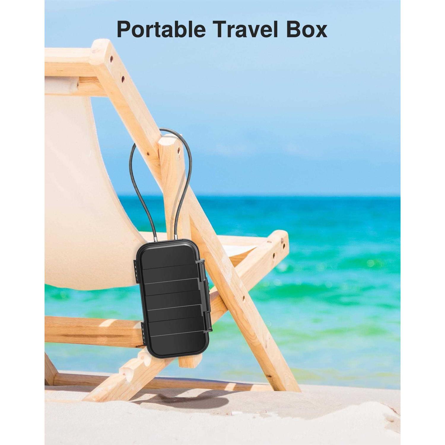 High-Security Safe Box: This travel safe box features a resettable 4-digit code that provides up to 10,000 possible combinations. The 4-digit password is not easy to be cracked and has high security. Easy to Carry: This portable safe box comes with a removable cable handle. When you are at the beach or gym, you can temporarily store your personal belongings without worrying about leaving them unattended. Convenient to use when traveling or going out. Waterproof Lock Box: Professional-grade sealed silicone waterproof ring leaves no gaps to protect the box from water ingress. The sturdy ABS shell of the beach safe box is solid and durable, anti-collision, anti-fall, and waterproof. Large Capacity: The security case provides ample internal space. High-density EVA liner with a shock-absorbing design protects valuables placed inside. Perfect for storing cash, credit cards, passports, watches, jewelry, mobile phones, USB cables, keys, car keys, and other items. Wide Applications: Puroma lockbox features a portable size and safe design. The length of the cable handle is 22.4 inches; it can be used in a wide range of places: beach chairs, basketball stands, football stands, bicycles, treadmills, etc. Perfect for outdoor camping and beach trips. Ideal gift for your family and friends. Product Name: Puroma Beach Safe Box, Portable Travel Safe Box Item Type: portable safe for travel, portable lock box, beach lock box, lockboxes for personal items Color: Black Lock Type: 4-Digit Combination Code Lock Material: The lock body is ABS plastic, metal rope (steel wire is carbon steel, the leather case is PVC material, the metal head is 303 stainless steel), password wheel is zinc alloy Special Feature: 1. The four-digit password combination provides you with 10,000 possible combinations. The 4-digit password is not easy to be cracked and has high security. 2. Easy to use, easy to reset password mechanism. 3. ABS shell, solid and durable, anti-collision and anti-fall. 4. Built-in silicone waterproof ring, good waterproof performance. 5. There is EVA lining inside, a shock-absorbing design that protects the items placed inside. 6. Large capacity, can store mobile phones, credit cards, passports, keys, car keys, and other items. 7. The steel rope is made of carbon steel, which has high hardness and can prevent it from being cut. 8. The length of the steel rope is 54.8cm, and it can be used in a wide range of places, such as beach chairs, basketball stands, football stands, bicycles, treadmills, etc. Usage: Portable Safe Box, Combination Security Case, LockBox with Code, Travel Safe Box, Portable Key Lock Box Application Scenarios: Home, Hotel Room, Commercial Office Use, Cars, Trucks, Dormitories, Gym, Campers, Beach Trips, Dorm Room, Dorm Safe, Travel Security, Flexsafe