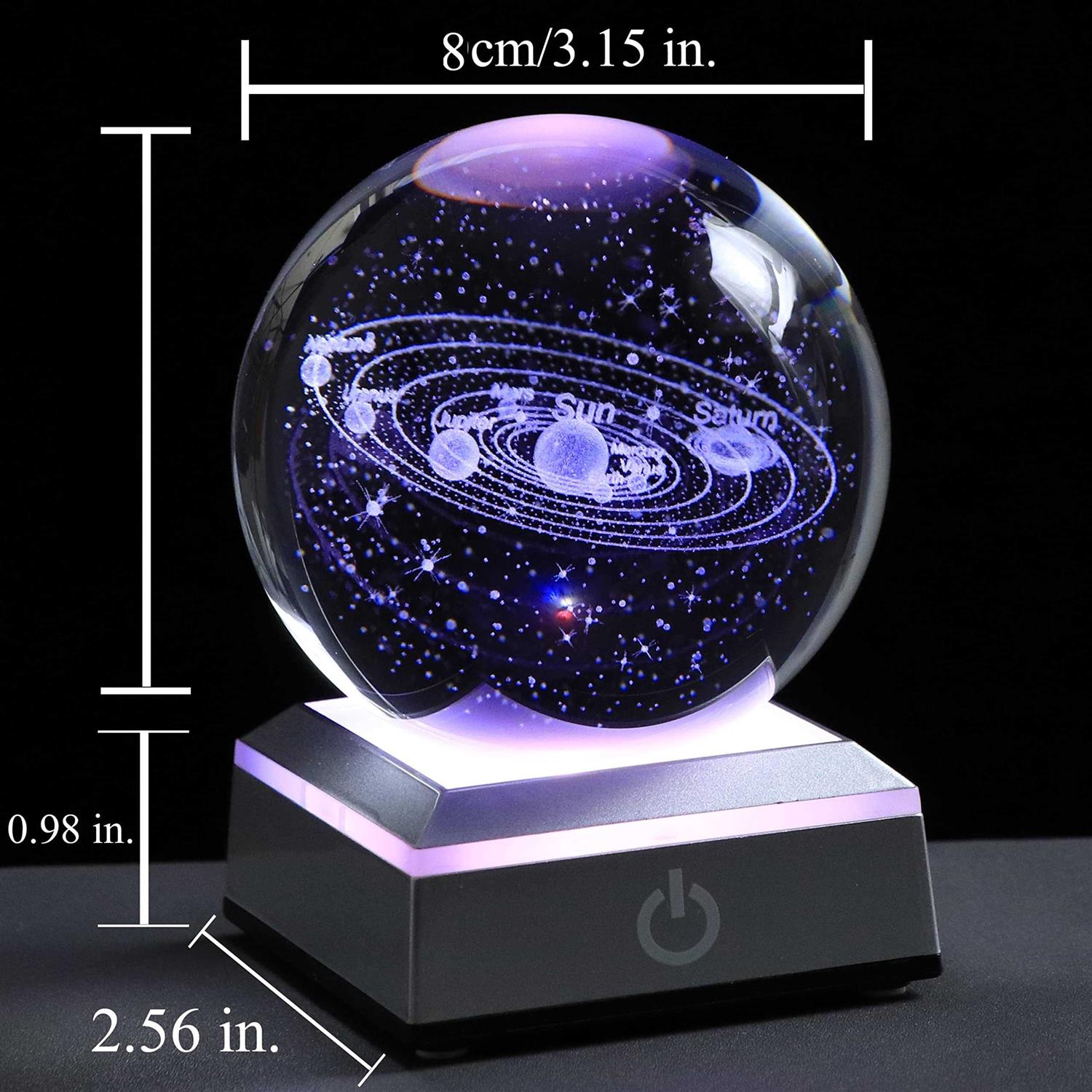 QUALITY MATERIALS: Made with K9 Crystal, Making the Ball More Transparent and Glossier, Names of Planets Etched in the Glass Ball are Clear, Beautiful Stars are around the Planets 3D LASER ENGRAVING: Model Engraved with the Advanced 3D Laser Engraving Technology are Clear, Distinct and Stereoscopic,the Crystal will not Fade Forever. SPACE THEMED GIFT: This solar system model is not only a great educational tools, but also a very cool science or space gifts and toys for your family, friends, boy/girlfriend, astronomy lovers, teachers and classmates. HOME & OFFICE DECOR: The led lamp base presents 6 colors light: slow and quick flashing light, white, blue, green and red light. The 6 colors can be adjusted automatically and making the sun system crystal sphere so cool and beautiful in darkness. Perfect for your home and office decor. PACKAGE INCLUDE: 1x Crystal Ball ( 80mm / 3.15inch ), 1x USB Cable, 1x Beautiful Gift Box, 1x LED Light Base ( 2.67×2.67×1.18 inch ). ( Please note: No batteries provided by the seller ). Product Features: 1. Solar System Model Crystal Ball is Made with K9 Crystal, very Transparent and Glossier. 2. Planets of the Solar System is Laser Carving, Beautiful Stars are around the Planets, You can Hold Solar System in Hand. 3. Color of light: The light will change color automatically 4. The Touch Switch on the Base is Easy to Use by Click. You can connect the Power Via a USB Cable. 5. Exquisite Gift of Birthday or Holiday for Children Astronomy Fans Physics Teachers Boyfriend Classmate and People Who are Interested in the Space Color of Crystal: Clear Material:K9 Crystal Crystal Size:80*80*80mm (3.15*3.15*3.15in) Crystal Weight:0.64kg (1.4 lbs) Color of LED Lighting Base:Silver Material:Plastics Package Include: 1 x 3D Laser Engraved Crystal Ball 1 x LED Base 1 x Data Cable 1 x Nice Gift Box