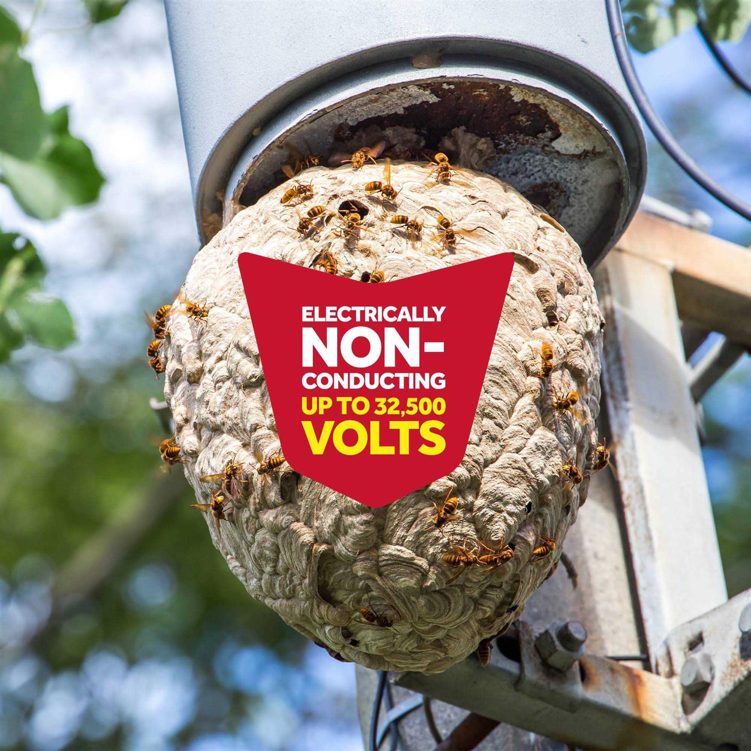 Raid Wasp and Hornet Killer 33 kills hornets, mud daubers, wasps and yellow jackets on contact and is electrically non-conducting up to 32,500-Volt. It sprays up to 22 ft. allowing you to spray from a safe distance. It is effective in killing the entire nest.