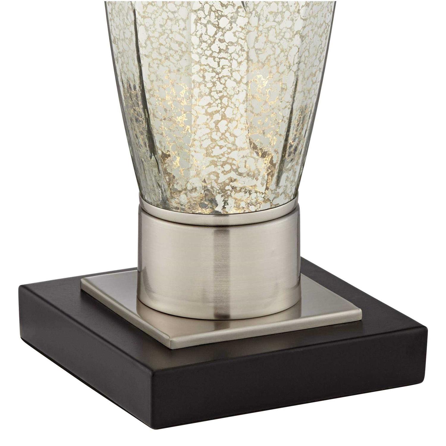- Mercury glass base construction. Black finish square resin pedestal at the very bottom of the lamp.