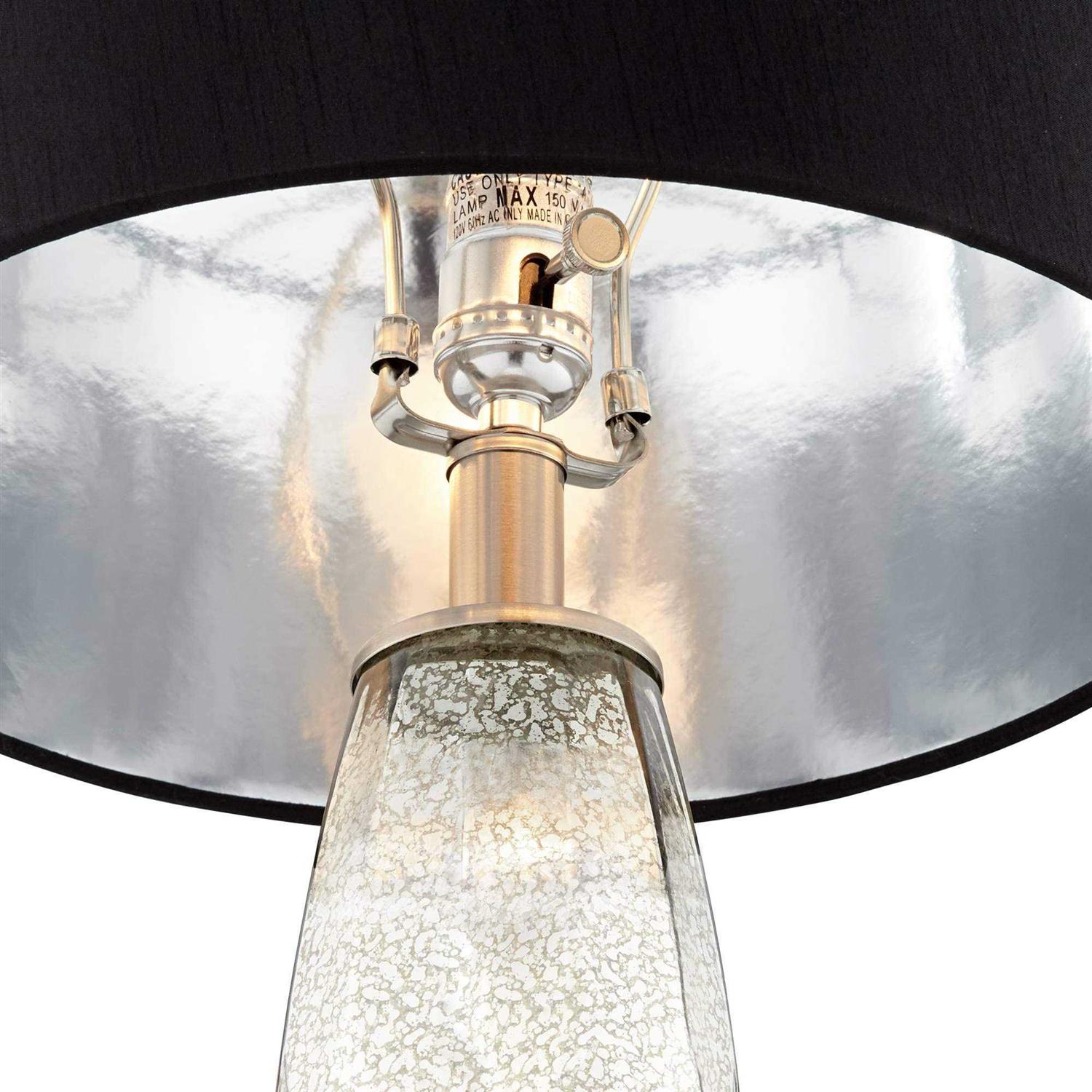 Each is 27 1/2″ high overall. Bottom bases are 5 1/2″ square. Weigh 9.7 lbs. Shades are 11 1/2″ across the top x 13″ across the bottom x 9 1/2″ high. Each uses one maximum 150 watt standard-medium base bulb (not included). On/off switch on the socket. Modern luxe style from the Regency Hill brand. Glass construction. Black fabric shades. 8-foot long clear cords. Create a cohesive look in your home with this stunning pair of table lamps. Sporting a spectacular mercury glass construction, each lamp comes with a sleek black shade. A design from the Regency Hill brand.