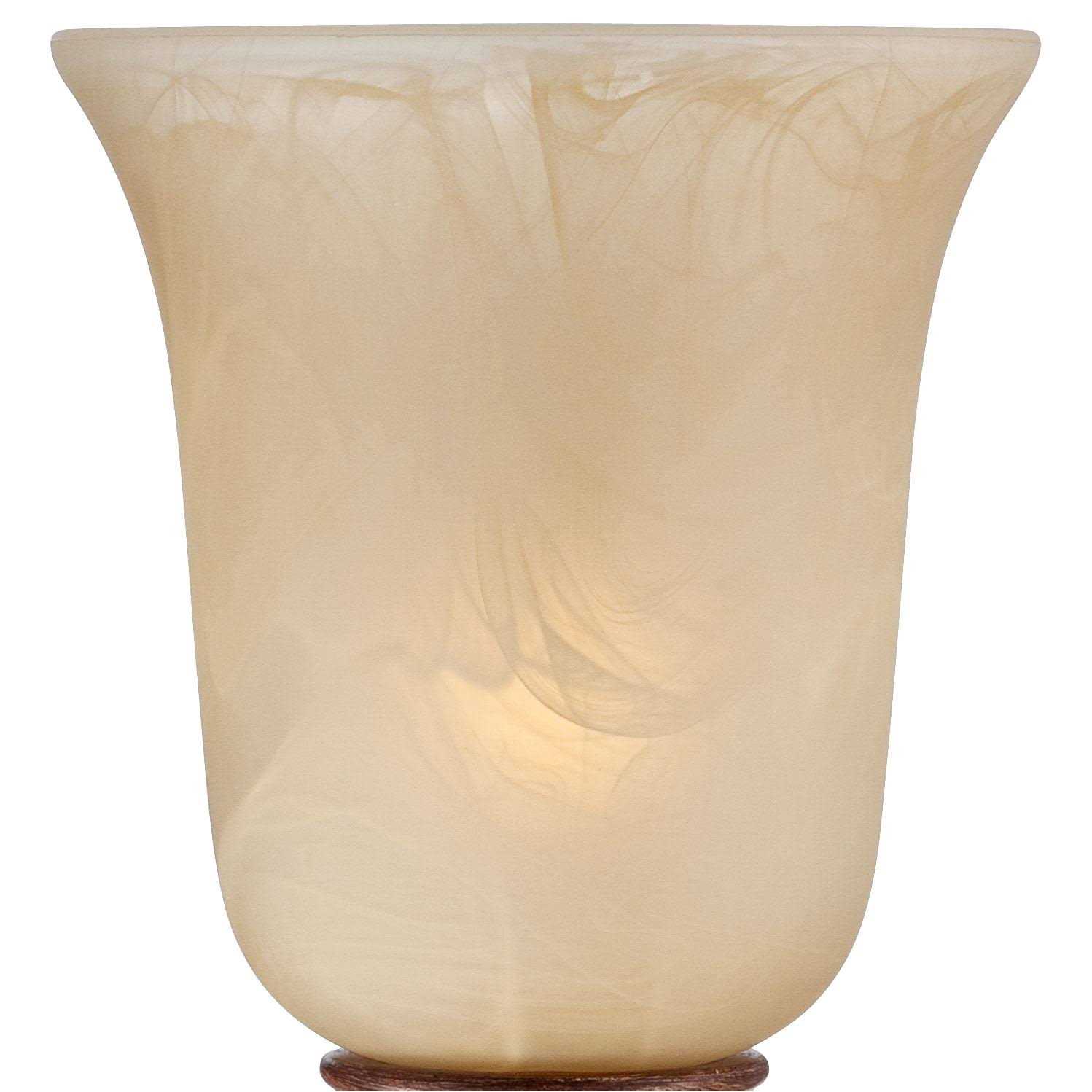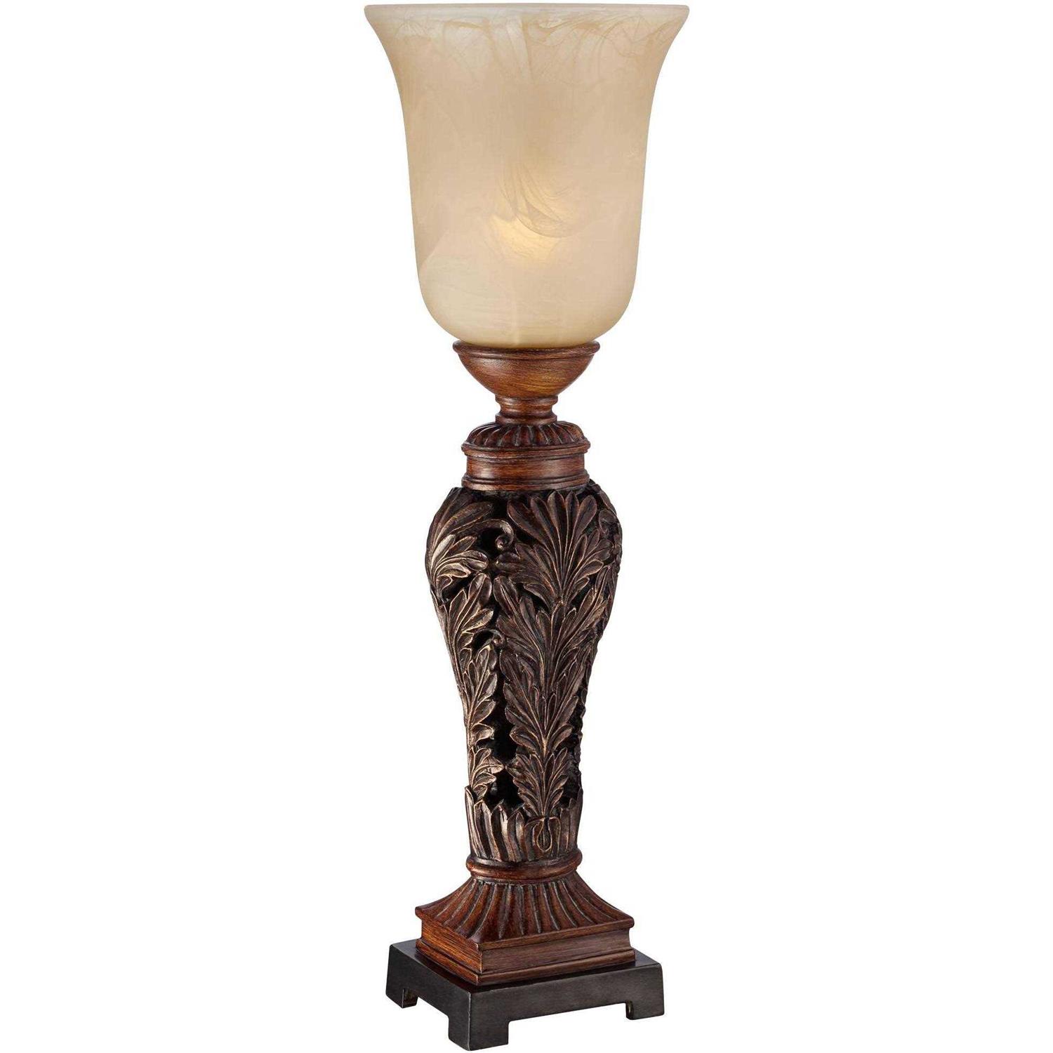 Product Details An intricate console lamp that is rich with texture, warm coloring, and elegant details. Additional Info: A stunning sculpted urn base gives this double bronze finish console lamp its distinctive look. The two different hues add warmth and richness to the beautifully textured base. A timeless alabaster glass shade tops this exquisite design. A decorative lighting design from Regency Hill. 24″ high overall. Base is 7 1/2″ wide. Glass only is 8″ high x 7 1/2″ wide. Weighs 5.2 lbs. Uses one maximum 60 watt standard-medium base bulb (not included). In-line on-off switch. A traditional console lamp. From the Regency Hill collection of accent lamps. Double bronze finish, carved leaf detailing. Fine cast resin construction. Console accent lamp with alabaster glass. 8-foot long cord.