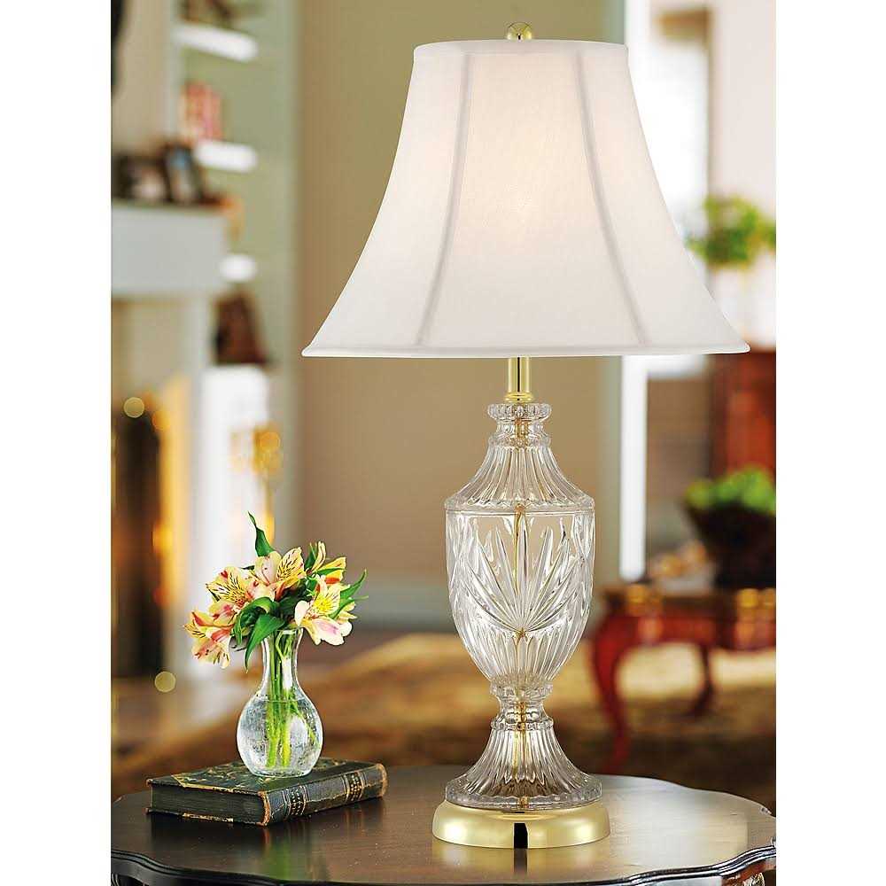 Product Details A classic shape and cut glass detailing makes this table lamp a handsome addition to any traditional home. Additional Info: Beautiful cut glass catches the light in the most glamorous of ways on this table lamp. Brass accents give it a regal look and feel. The classically shaped shade adds to its graceful presence. 26 1/2″ high overall. Base is 6″ wide. Shade is 7″ across the top x 15″ across the bottom x 11″ on the slant. Uses one maximum 100 watt standard base bulb (not included). On-off socket switch. Cut glass table lamp base. Classic urn traditional lamp shape, from the Regency Hill collection of table lamps. Brass finish metal accents on base, finial, and lamp neck. Flared Empire-style white-cream shade on top. 8-foot long clear cord.