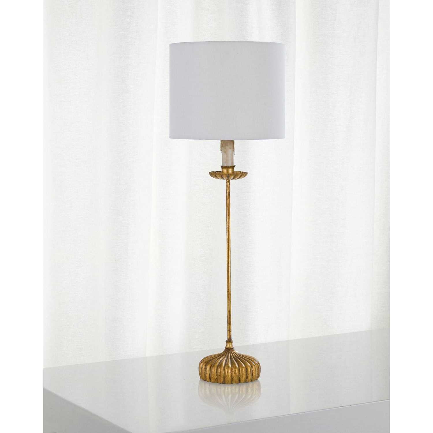 With an antique gold leaf finish, this Clove Stem buffet table lamp designed by Regina Andrew Design boasts a fine quality that can complement any setting. Made with cast iron, steel and polyresin, this lamp is decorative and strong. The hardback linen fabric shade atop this lamp reinforces the traditional beauty exuded from top to bottom.