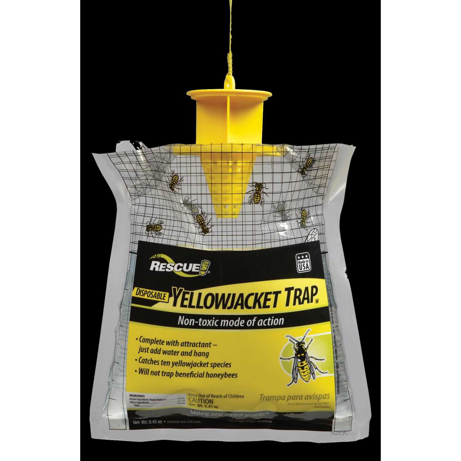 Designed for use from summer through fall, the RESCUE! disposable yellow jacket trap is an effective and low-maintenance way of controlling yellow jacket infestations on your property, or on camping and picnic trips. The exclusive attractant is formulated to lure dozens of species. Simply add water to the powdered attractant, and hang at least 20 feet away from outdoor activity areas. Attractant lasts for weeks, with no rebaiting necessary.