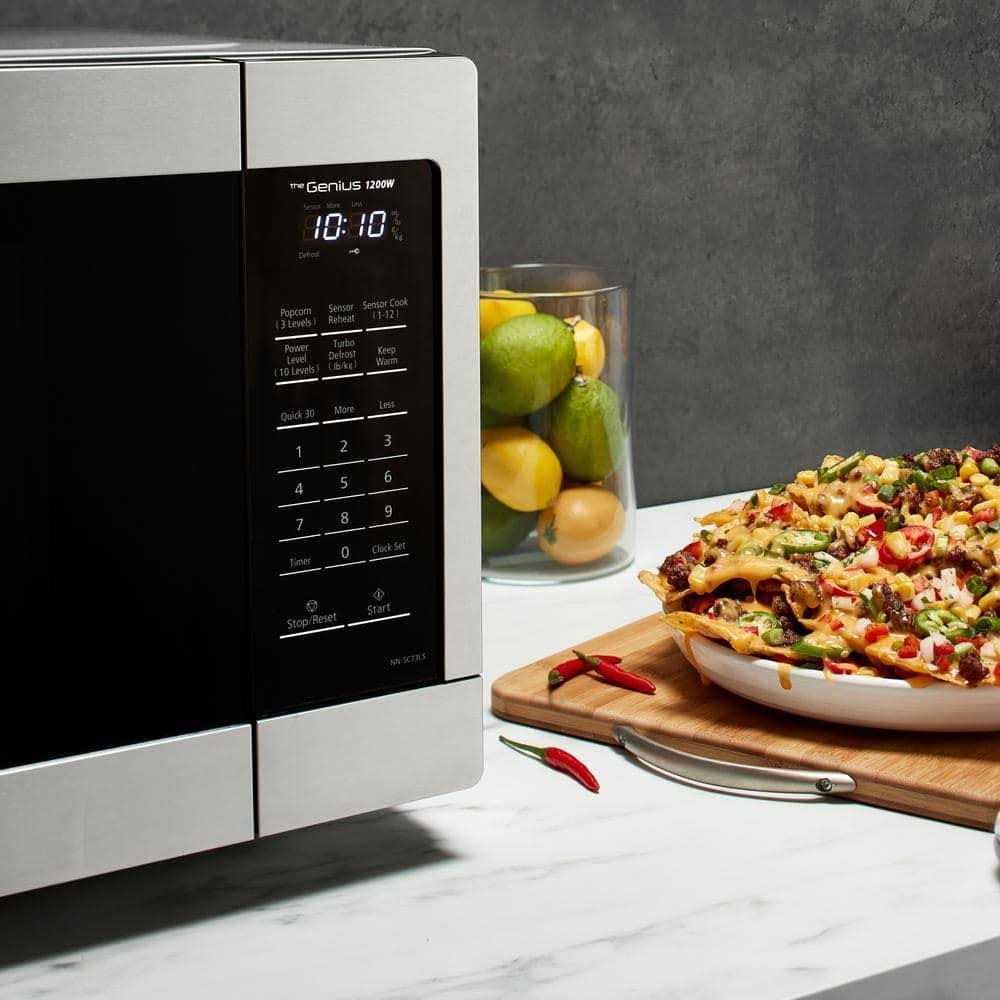 The Panasonic NN-SC73LS microwave with Inverter Technology uses 1200-Watt of cooking power to cook, defrost, reheat and more. Unique Inverter Technology which, unlike traditional microwaves that rely on pulse-on, pulse-off power at lower temperatures, delivers a constant stream of cooking power at every temperature for more evenly cooked meals – edges to centers – every time. With the touch of the Genius Sensor cooking button, this microwave takes guesswork out of creating a great meal by automatically setting power levels and adjusting cooking or defrosting time for added time-saving convenience. The sensor measures the amount of steam produced during cooking and signals the microprocessor to calculate the remaining cooking time at the appropriate power level. A selection of 10-auto cook options enable you to quickly prepare your favorite foods, such as pizza, pasta, soup, casserole and other dishes, plus enjoy a dedicated popcorn button, keep warm function and more. Spacious 1.6 cu. ft. interior includes 13.6 in. glass turntable and fits a large baking dish. The stainless steel exterior design can rest on any open surface in the kitchen and can be easily moved.
