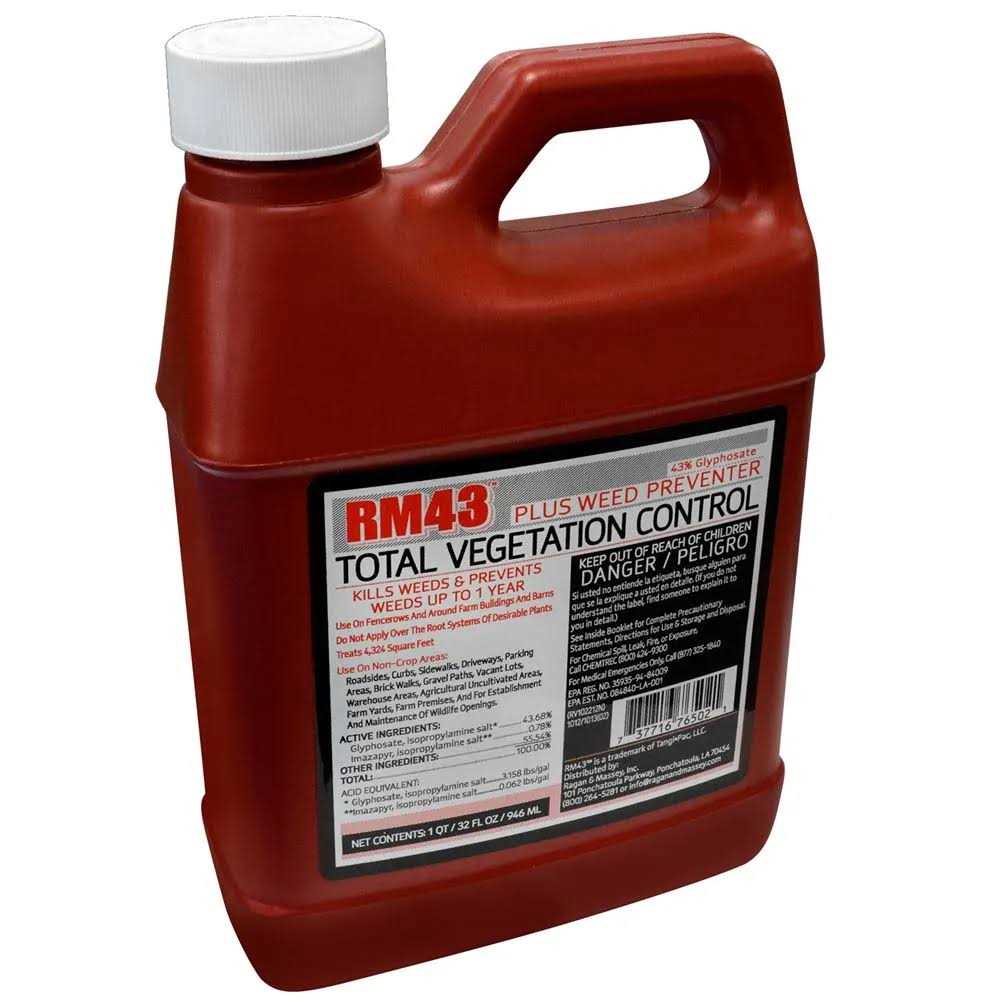 RM43 is your solution for total vegetation control on bare ground or for spot control of brush, vines and over 150 weeds, including kudzu, poison ivy and poison oak. It kills existing weeds and prevents future growth on walkways, roadsides, fence lines and any place you want to keep free from invasive plants. Features a combination of two herbicides – glyphosate to kill the weeds and imazapyr to prevent new growth. Also includes a surfactant. Rainfast in two hours. No entry restrictions to sprayed areas for pets or people after the spray has dried.