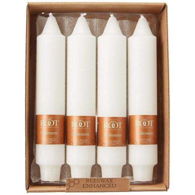 Root – The Best Candles in America, Made in America. Collenette candles have a distinctive, formal profile that lends itself to traditional, formal presentation. A wider diameter virtually assures a flawless performance by eliminating drips. These Timberline Collenette Dinner Candles are 7-inches tall and have a wide 1.25″ diameter with a 7/8″ tapered base to fit into any fine dinner candle holder. The Timberline finish resembles the smooth weathered bark of a tree, capturing the bold spirit of the great outdoors. Root Candles Timberline Collenette candles burn an impressive 2-1/2 hours per inch and are available in a designer palette of? 4 year roundolors and 8 seasonal colors that rotate throughout the year. Available in a wide variety of lengths – 5″, 7″, and 9″. Root Candles is an iconic American company that traces its lineage back to 1869 when founder Amos Ives Root first opened his doors for business in Medina, Ohio. Since then, 5 generations of Root candlemakers have created the best candles in America. Using all-natural materials for purity and balance, Root candles seduce your senses, enhance your living space and soothe your soul. Candles are manufactured according to all ASTM (safety) standards. Root manufactures their own all-natural cotton wicks and test burns 1,000 candles every day to check fragrance throw, emissions, soot, flame strength, stability, useful life, welling, dripping, and burn time. Stringent color matching is done daily to ensure consistent quality from batch to batch.