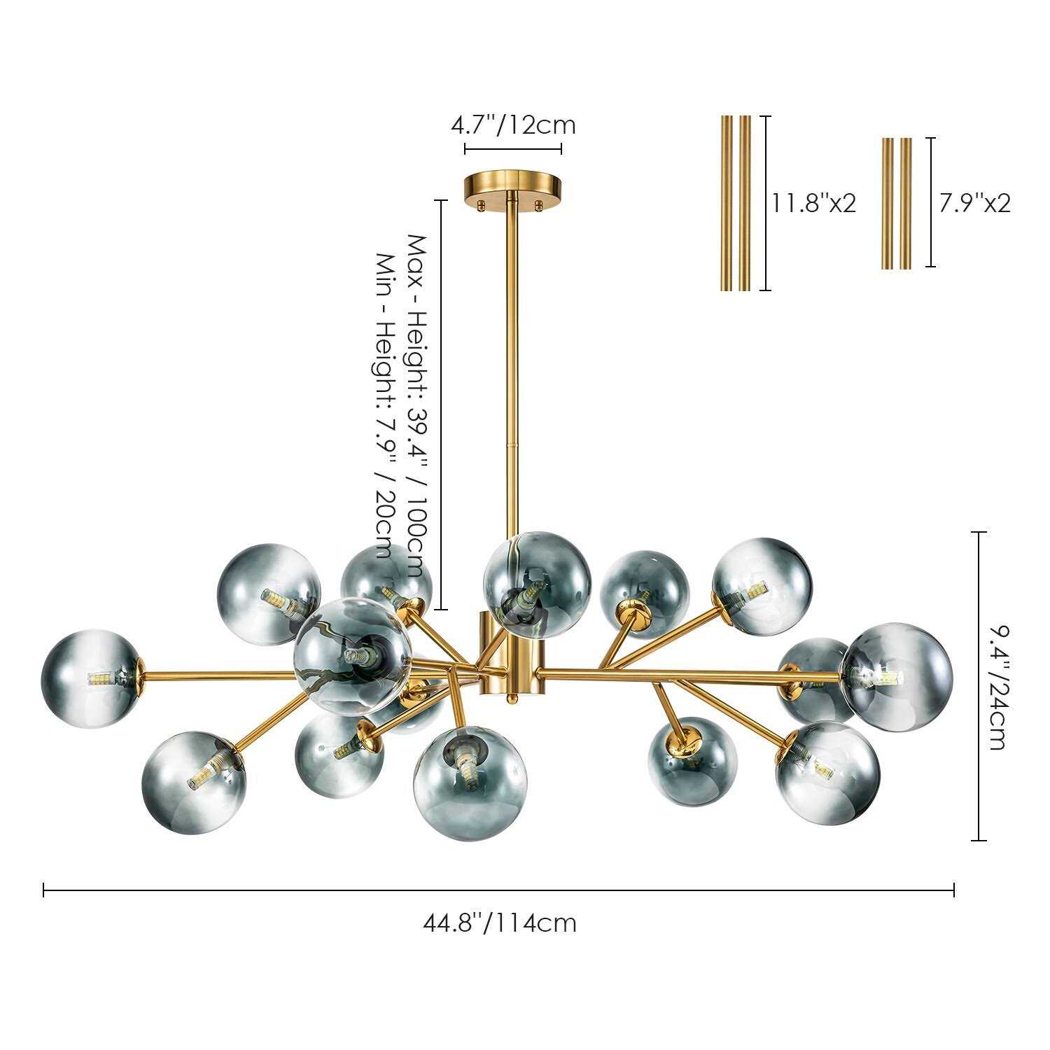 RRTYO 15-Light Modern Sputnik Branch Cluster Glass Globe Bubble Chandelier Gold Grey Glass Polished Gold