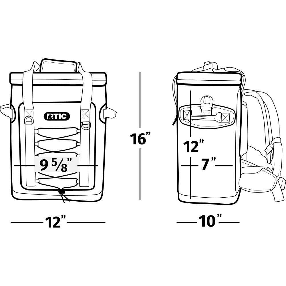RTIC Backpack Cooler The insulated cooler backpack is perfect for a day hiking, camping, picnic, fishing, a day on the beach, or at the pool. A hands-free carry cooler bag that straps comfortably to your back, leaving both arms free for what your adventure calls for. It will keep your food and drinks cool wherever needed. With the bonus of being a floating cooler bag, it floats, so your drinks and snacks can go wherever you go.The drink and food cooler measures 12 x 10 x 16 inches. 100% Waterproof And It Floats Too The cooling bag cooler is built with premium insulation and will keep your items cold for days. It makes an ideal beverage cooler, travel cooler, beer can cooler, lunch box cooler, camp cooler, fishing cooler, boat cooler, beach cooler, and more. Its a leak-proof cooler bag. A durable zipper protect your drinks and snacks and prevent spills and leaks. Comes in a 20 can cooler bag and 30 can cooler bag size.