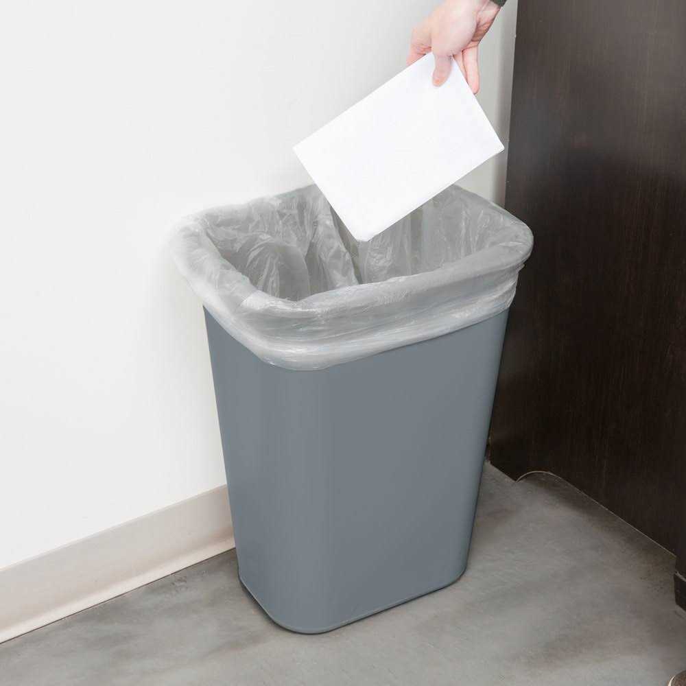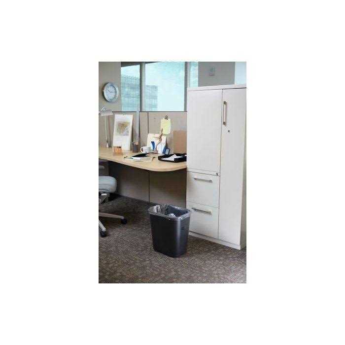 The Rubbermaid Commercial Deskside Trash Can is space-efficient and economical. This waste basket fits under a standard desk height, even when the swing top is fully extended. Its all-plastic construction won’t chip, rust, or dent. These waste baskets feature rolled rims to add strength, and are easy-to-clean.