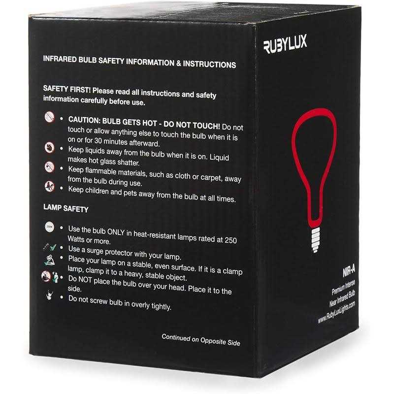 Near Infrared Light Therapy Bulb Designed for Near Infrared Heat Lamp Therapy and Saunas. Produces 1431 mW/cm2 at 6” Away! Near Infrared Light Therapy Increases Collagen, Skin Elasticity, Relieves Pain, Speeds Healing and More! No UV to Block, No Teflon, No Fluorinated fumes, No Mercury Vapor, No Toxic Substances and No FAR Infrared. CE certified. Safest Brand on the Market! RubyLux Accepts Returns for Any Reason within 60 Days of Purchase! Longest Life! Lasts 2+ Years! Compare to Mere Weeks from Other IR Lamps or Only Months from Brand X Bulbs!