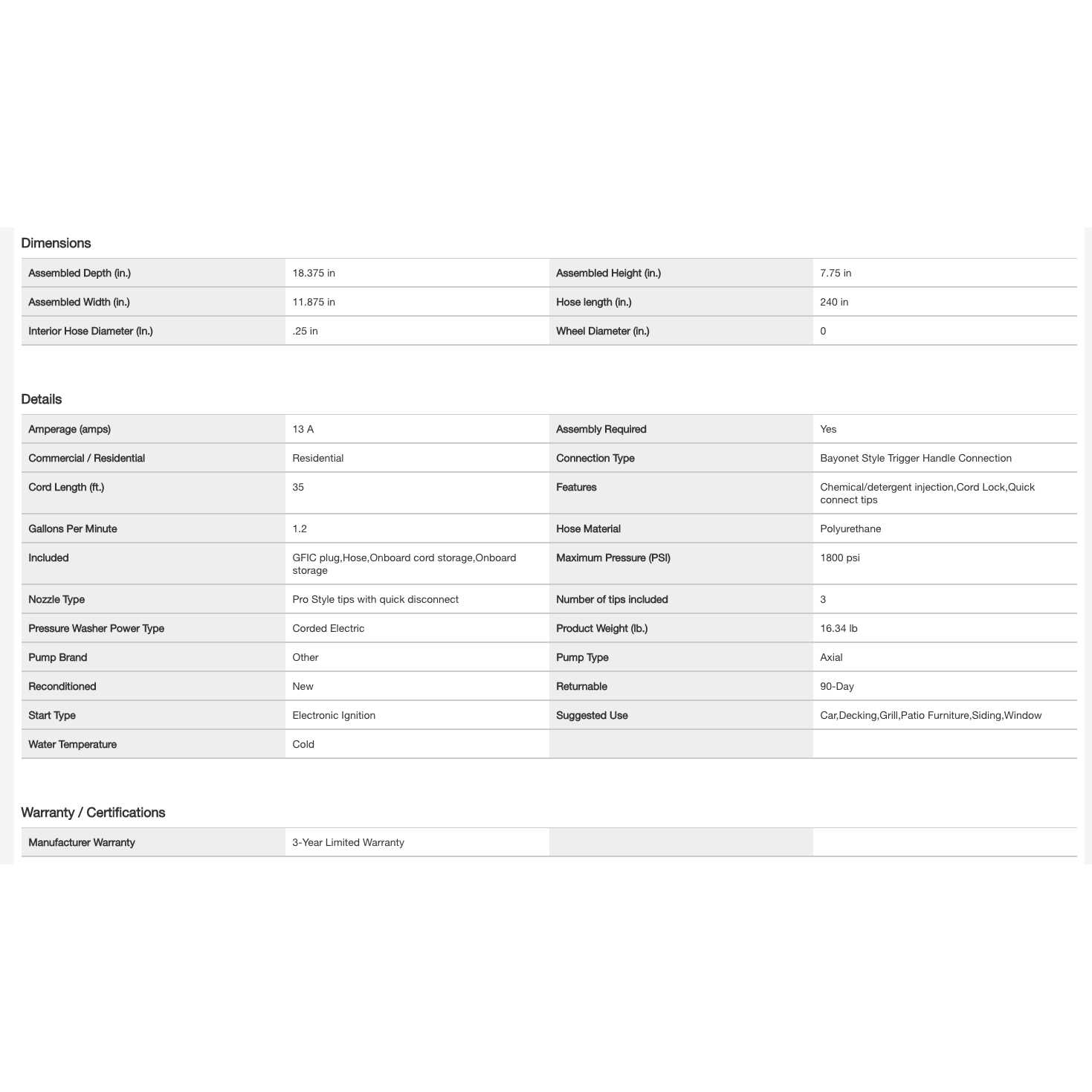 Deep clean windows, decks, patio furniture and more with this 1800 PSI 1.2 GPM cold water electric pressure washer. The turbo nozzle delivers up to 50% more cleaning power, and three quick-connect nozzles clean different kinds of surfaces. The lightweight and compact design makes it easy to move.
