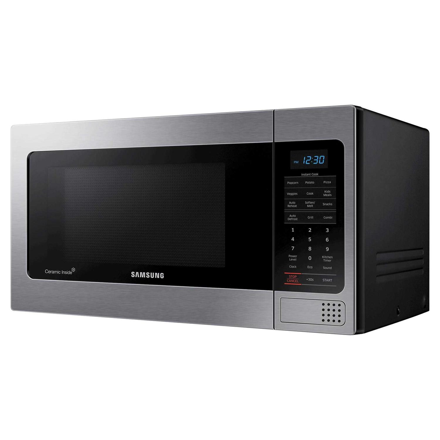 1.1 cu. ft. Countertop Microwave Oven with 1,000 Watts, 10 Power Levels, Auto Cook Options, Grilling Element, Ceramic Plate, Ceramic Enamel Interior, Auto Defrost, Eco Mode, Triple Distribution System, Glass Turntable and Ceramic Enamel Interior. Allows for crispy food, including pizza. Durable ceramic enamel interior provides a polished surface that’s easy to maintain. Effortlessly remove grease or oil from surfaces. Protects against scratches that occur from daily use. Handles any meal at the touch of a button. 1.1 cu. ft. Oven Capacity. 10 Power Levels. Various Cooking Mode. Weight/Serving Control. 2 Stage Cooking. Auto Cook. Auto Defrost. Grilling Element. High Rack. Ceramic Plate. Push Type Door. Child Safety Lock. 12-Hour Clock. Reminder End Signal. Sound Option. Oven Cavity: 1.1 cu. ft. Power Output: 1000 W. Power Consumption: 1600 W/14.5 A. Power Source: 120 V/60 Hz. Control Method: Electronic. Display: LED (Ice Blue) Display. Cooking Control: 10 Power Levels. Cooking Timer: Digital, up to 99 Minutes, 99 Seconds. Microwave Distribution System: Turntable. Color: Stainless Steel. Cavity Width: 14 3/4″. Cavity Depth: 14 3/4″. Cavity Height: 10 1/16″. Product Width: 20 3/8″. Product Depth: 15 13/16″. Product Height: 11 11/16″. Product Weight: 35.3 Lbs.