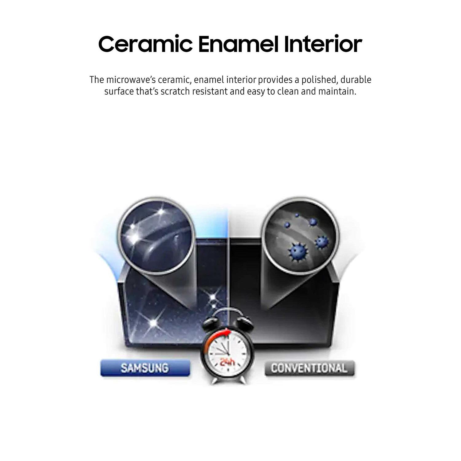 Samsung’s 1.4 cu. ft. countertop microwave combines sophisticated style with top-tier performance. The ceramic enamel interior provides a durable, quick-clean surface and exclusive Sensor Cook technology automatically adjusts cooking time for hassle-free, precise results. Various presets and a state-of-the-art triple distribution ensure optimally cooked, homemade dishes that are both healthy and full of flavor – from sides like green beans and brown rice to entrees such as boneless chicken and salmon fillets. Striking ice blue LEDs and a sleek stainless steel finish add a high-end touch to your kitchen space, while large, easy-read displays make for greater cooking convenience.