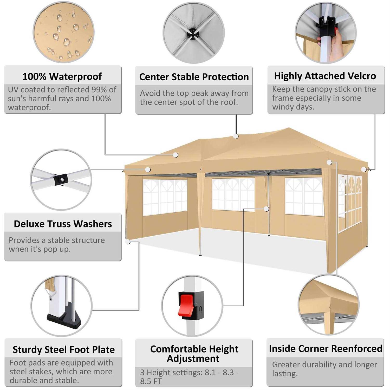 NEWEST Height-adjustable 10’x 20′ right-angle folding portable outdoor party canopy with sidewalls and mesh windows is waterproof, especially suitable for outdoor use. This canopy tent is made from a rust-resistant powder-coated steel frame and durable waterproof 210D Oxford Cloth that helps this pop up tent endure all types of weather and block up to 99% of the sun’s UV rays. besides, Our gazebo tents can be used on hard surfaces such as decks, driveways, etc. Also can be used as a temporary garage for extra storage. You can store your car or tools. Ideal for commercial or recreational use – camping, picnics, parties, backyards, markets, sporting events, etc.