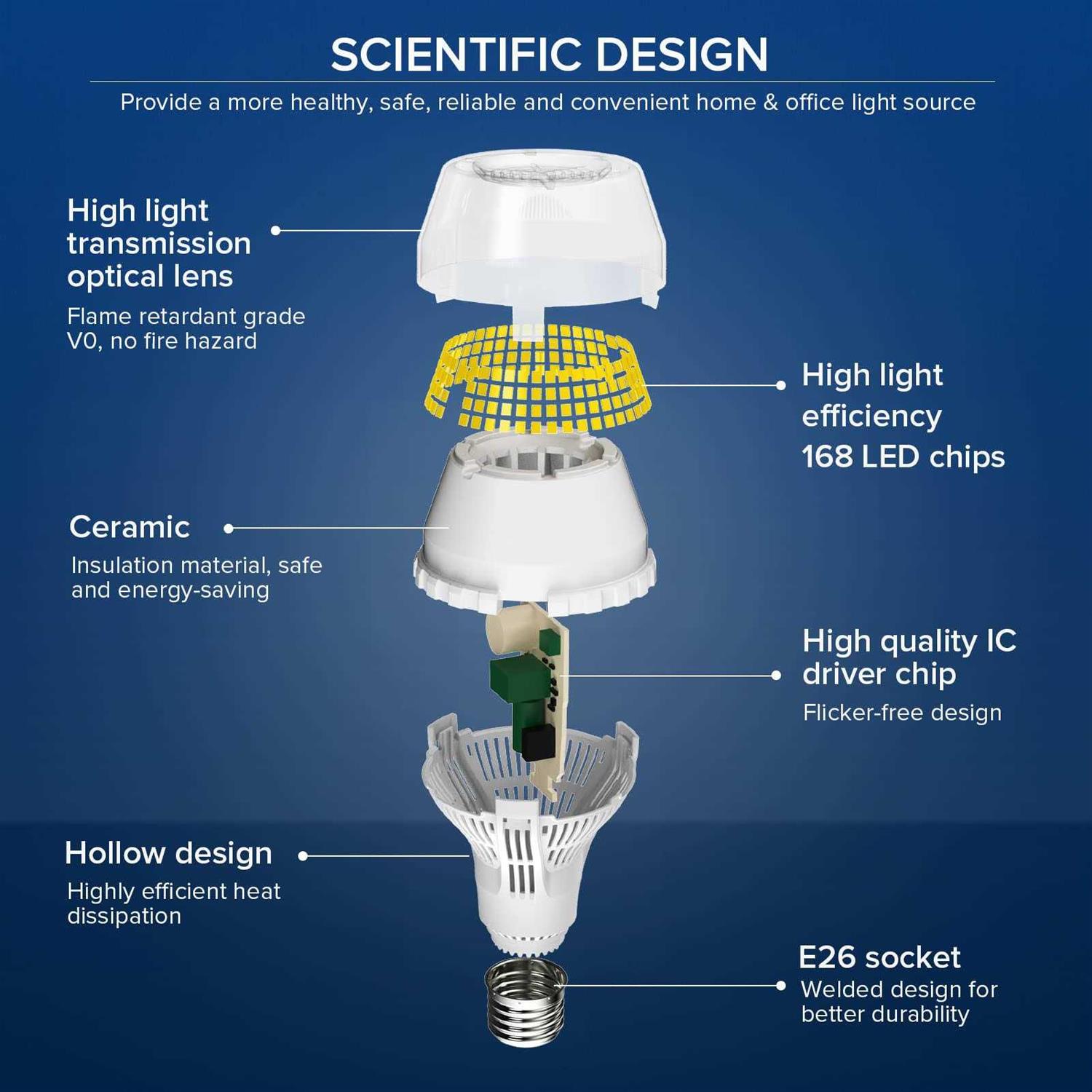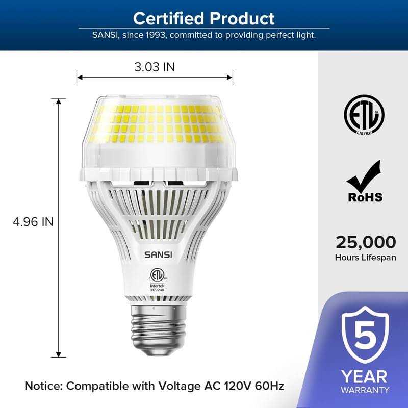 Super Bright & Wider Beam Angle: SANSI 300W equiv. 5000 high lumen LED bulb, at about 166 lumen/watt output, with a wider 270-degree beam angle provides an all-around light distribution, can illuminate a larger place even the darker corners, provides you with excellent lighting experience! Flicker-Free: Adopting high light transmission optical lenses, up to 168 LED chips can not only provide you and your family with the light source they need daily but also provide a healthy living or work environment. No flickering, no noise. Patented Ceramic Technology: SANSI’s patented technology replaces the traditional Mcpcb aluminum substrate with a non-conductive ceramic heat sink, directly soldering the LED chip on the ceramic heat sink, effectively reducing the system thermal resistance between the LED PN junction and the surface of the heat sink, resulting in faster heat conduction and higher product reliability, making SANSI’s bulbs perform with higher light efficie