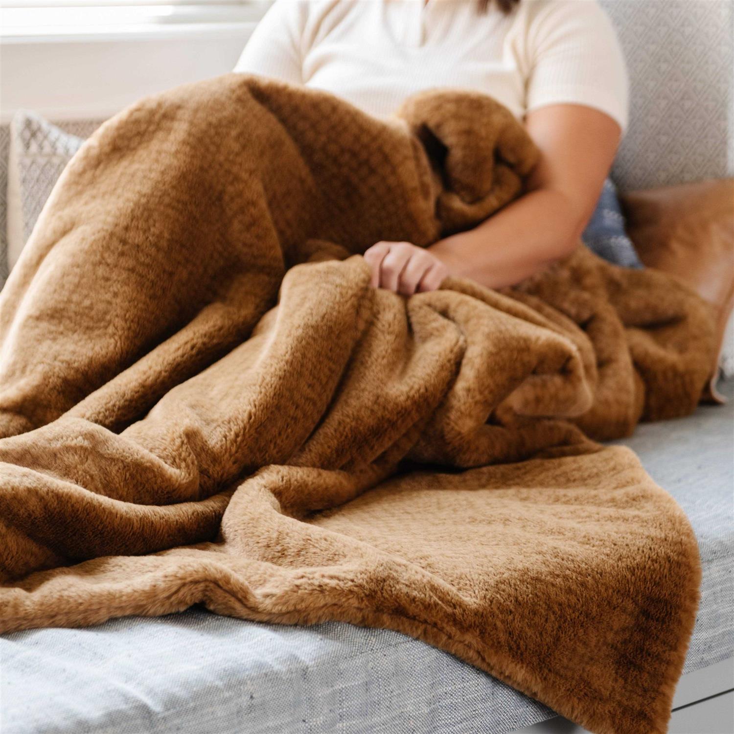 Size Home Throw – 50” x 60” Extra Large Home Throw – 60” x 80” Luxury You Can See Knit from the finest materials, the Golden Sable is an elegant color design that is sure to be an amazing accent to any bed or living space. Unmatched Softness Prepare to melt away into the softest blanket you’ve ever felt. Our hand-picked, custom knit, proprietary fabric is silkier than ever. The Saranoni Grand delivers double-sided comfort and luxury like you’ve never felt before. Both King and Queen sizes provide total coverage with a 16-inch drop to cover the sides of even the largest mattresses. Not even he could hog this blanket! Knit For Comfort Our custom-knit fabric is both dense and breathable to give you maximum comfort. The king weighs a whopping 15 pounds for that extra feeling of coziness and security. This unique, faux fur fiber is durable and will be your favorite piece of bedding for years to come.