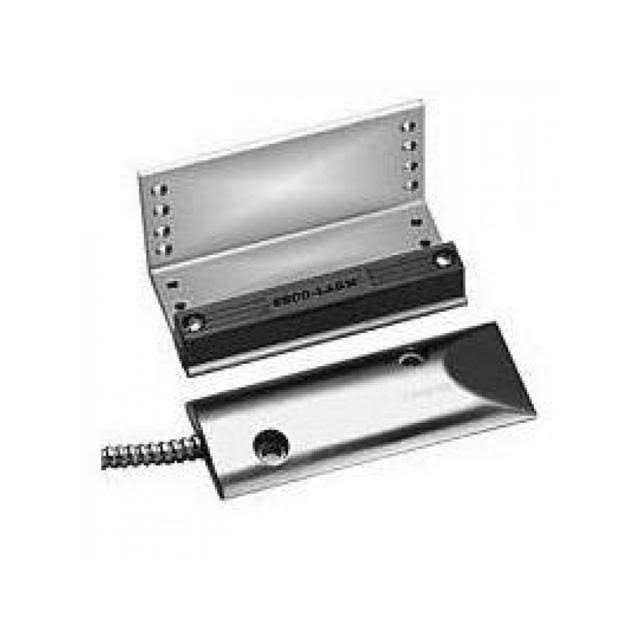 The Seco-Larm Enforcer Overhead Door-Mount Magnetic Contact, NO/NC is a contact switch designed for large doors and gates where regular contacts may be difficult to mount. The contact’s large gap allows use with even the largest doors, such as garage doors. The switch is contained in low-profile cast aluminum housing, and curved so that heavy vehicles can cross over without damaging it. Rugged, Long-Lasting Construction Seco-Larm contacts have a unique rhodium plating which has gone through a special oxygen treatment to deactivate the surface, thus eliminating the absorption of organic impurities, polymer growth during operation, and the possibility of contact freezing. The switch is housed in weatherproof die-cast aluminum constructed for surface-mounting on a garage floor. It can withstand heavy vehicle pressure without damage. The switch is safely enclosed in an epoxy compound, and a 24-inch flexible stainless-steel cable gives complete protection to the switch wiring. The magnet is housed in a high-impact weatherproof ABS plastic case and can be mounted on a garage door with an “L”-shaped bracket, which minimizes the effect of steel doors on magnets.