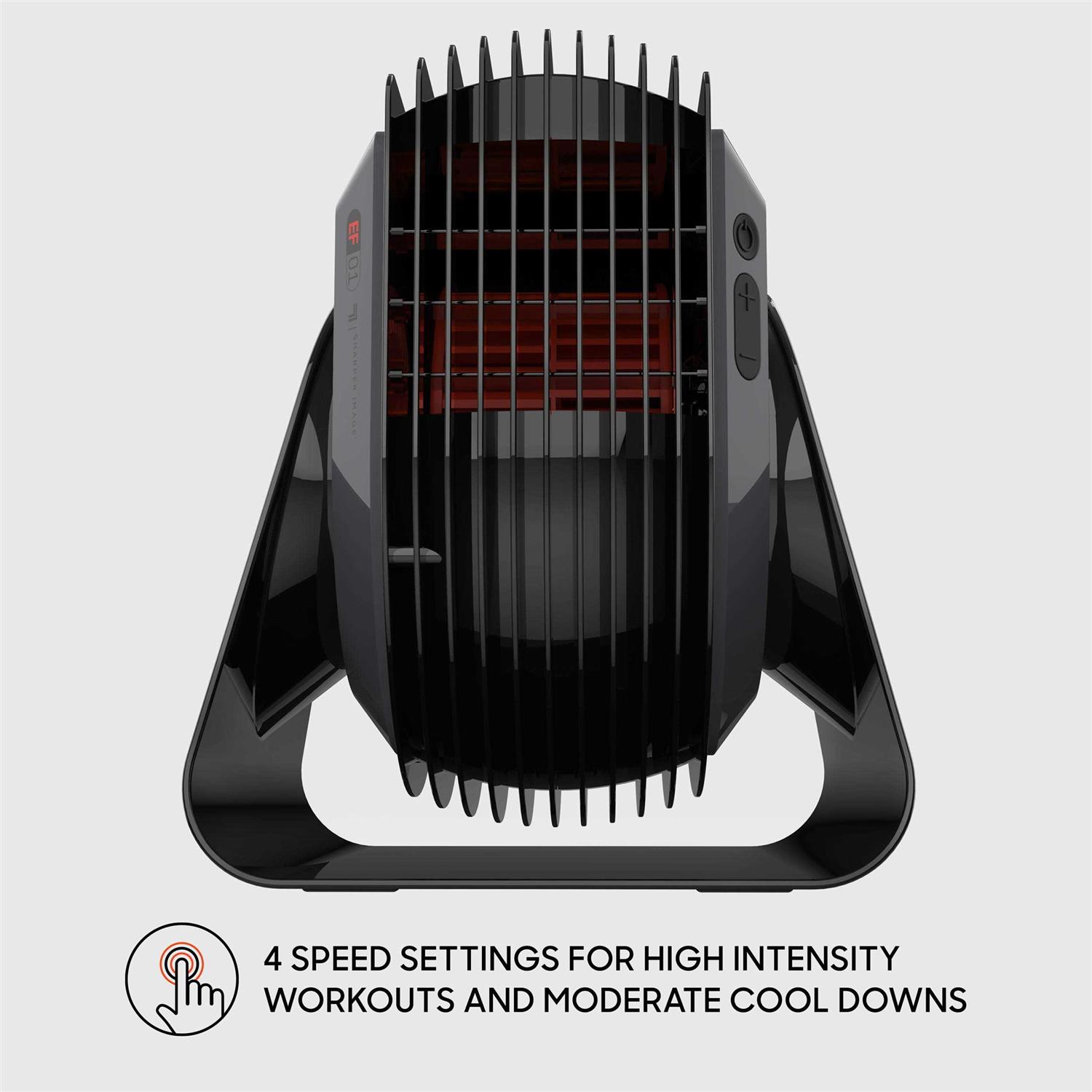 Features 4 fan speeds and a 180-degree tiltable fan-head. Powerful 950 CFM airflow simulates wind resistance for running, riding, & rowing while replenishing the air. Includes magnetic omnidirectional remote control.