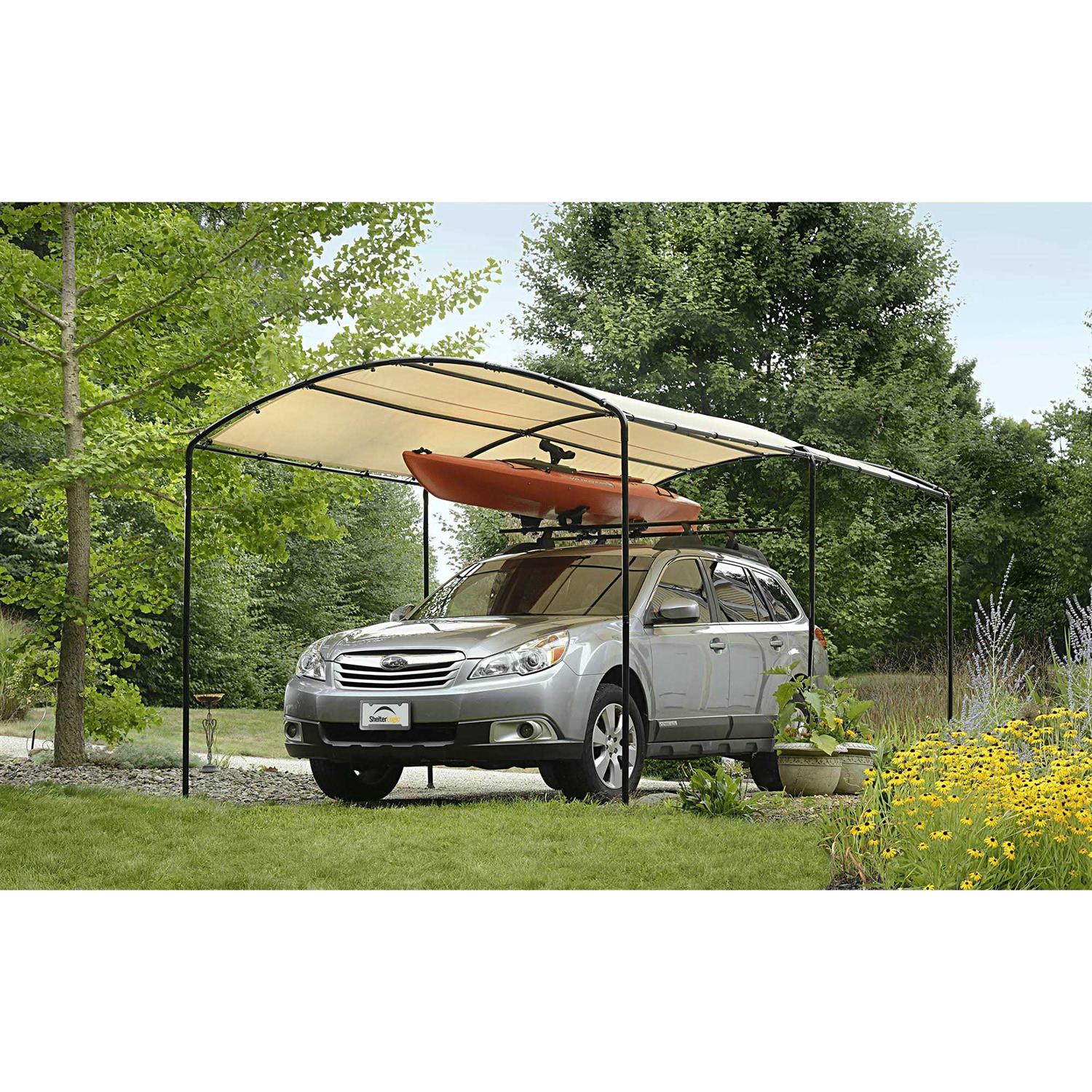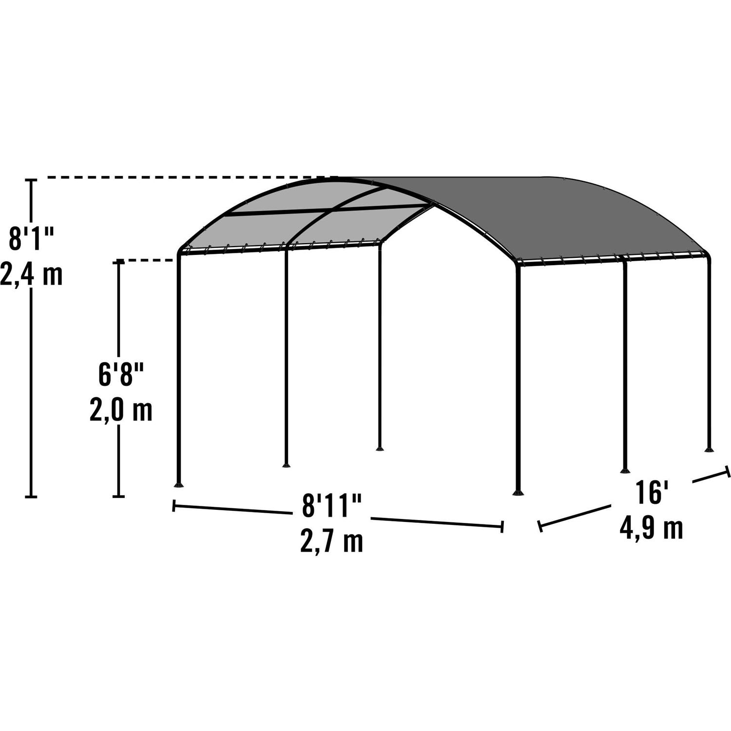 ShelterLogic Monarc Canopy line of all-purpose canopies features an arch shape, light colored polyethylene cover, and black frame. Appealing to a sophisticated consumer lifestyle, this unique canopy is both attractive and functional. Ideal for shade coverage and protection from inclement weather, this stylish canopy with clean lines and earth tones blends into any outdoor home dcor. It is easy to assemble and conveniently sized to fill most backyard needs. Monarc Canopy 9 x 16 ft.Stylish arch canopy with premium powder coated finish for unsurpassed quality. 5.5 oz. ripstop tough, Sandstone polyethylene fabric. 100% waterproof fabric, UV treated, welded seams. Sleek Sandstone cover accentuates the clean architectural lines of the arched canopy. No-valanced cover attaches easily and securely with bungees. The bolt-together frame assembly makes set-up quick and easy. Temporary spike anchors included. Proper anchoring is required for structural longevity and safety. See included Anchor Guide for more info.