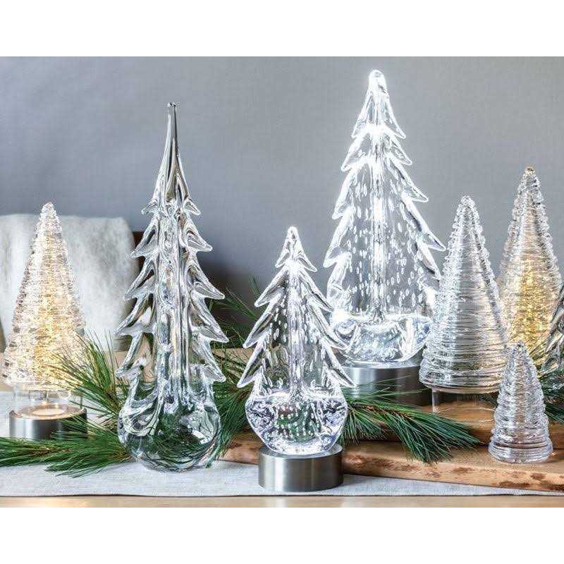 Highlight the brilliance and beauty of our smaller handblown glass designs by illuminating from below. This simple platform features LED lighting with a rechargeable battery. This season, our LEDs are a cool white tone.This light does run on a timer.