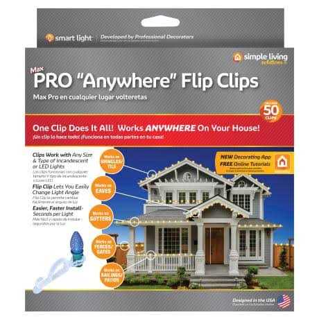 One clip does it all with Simple Living Solutions’ Max Pro Anywhere Flip Clips. Clips work with any size and type of incandescent or LED light. Install lights on gutters, shingles, eaves, wood shake, patios, fences and more using just one style of clip. Installation takes just seconds per light and flip clip design allows you to easily change the angle. Decorate your entire home with one bucket!
